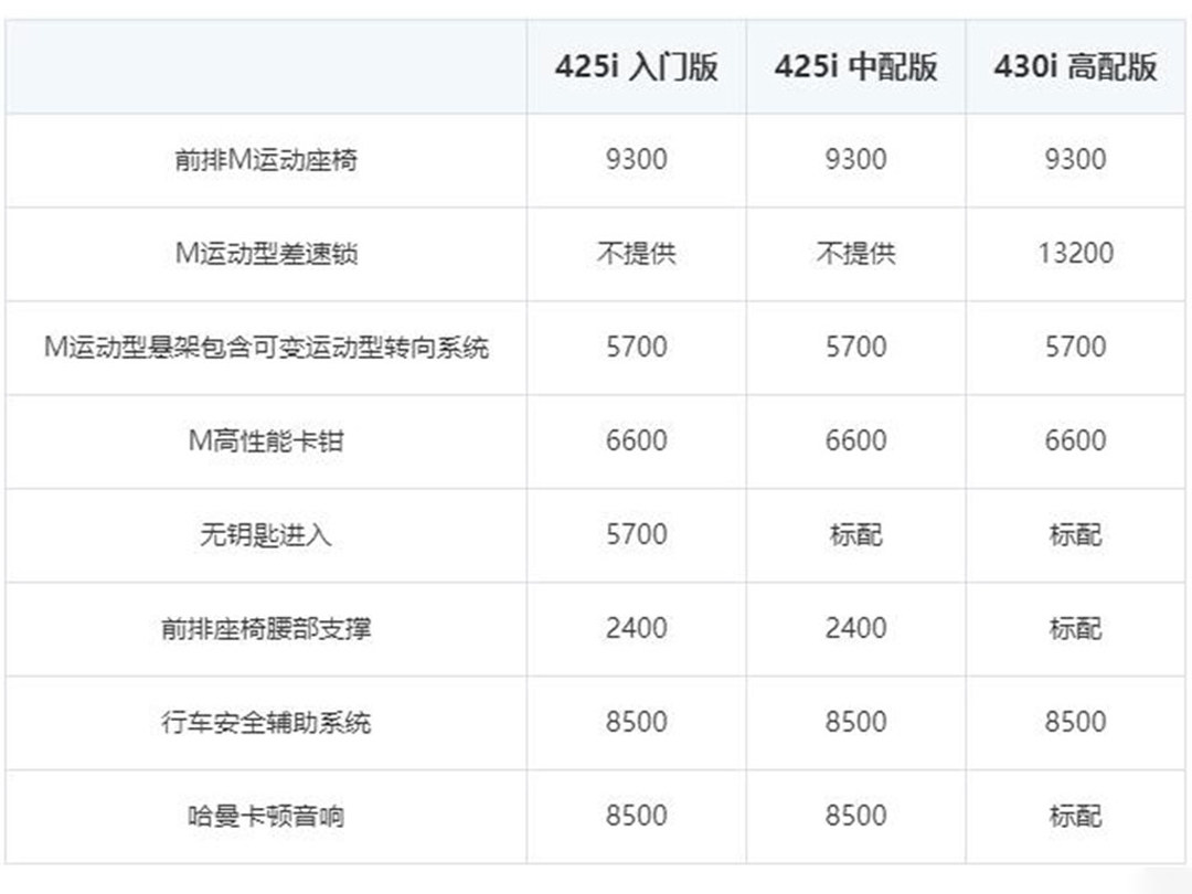 日前,有国内媒体曝光了即将在7月24日成都车展预售的全新宝马4系的新车配置。据悉,全新4系在国内上市三款车型,分别是425i(入门版)、425i(中配版)、430i(高配版)。外观上,根据不同的车型配置会提供不一样的前保险杠造型,预计分为豪华套装和M运动套装,除了入门版425i配18英寸轮毂以外,其余配置标配19英寸轮毂;颜色方面提供5种车漆可选。从曝光的动力信息来看,前期引入的三款车型都搭载2.0T发动机,分高低功率,高功率最大马力258匹,最大扭矩400N·m,低功率版本最大马力184匹,最大扭矩300N·m,匹配8AT变速箱。宝马4系的外观如此有特点,教授表示相当期待能在成都车展上看到实车。