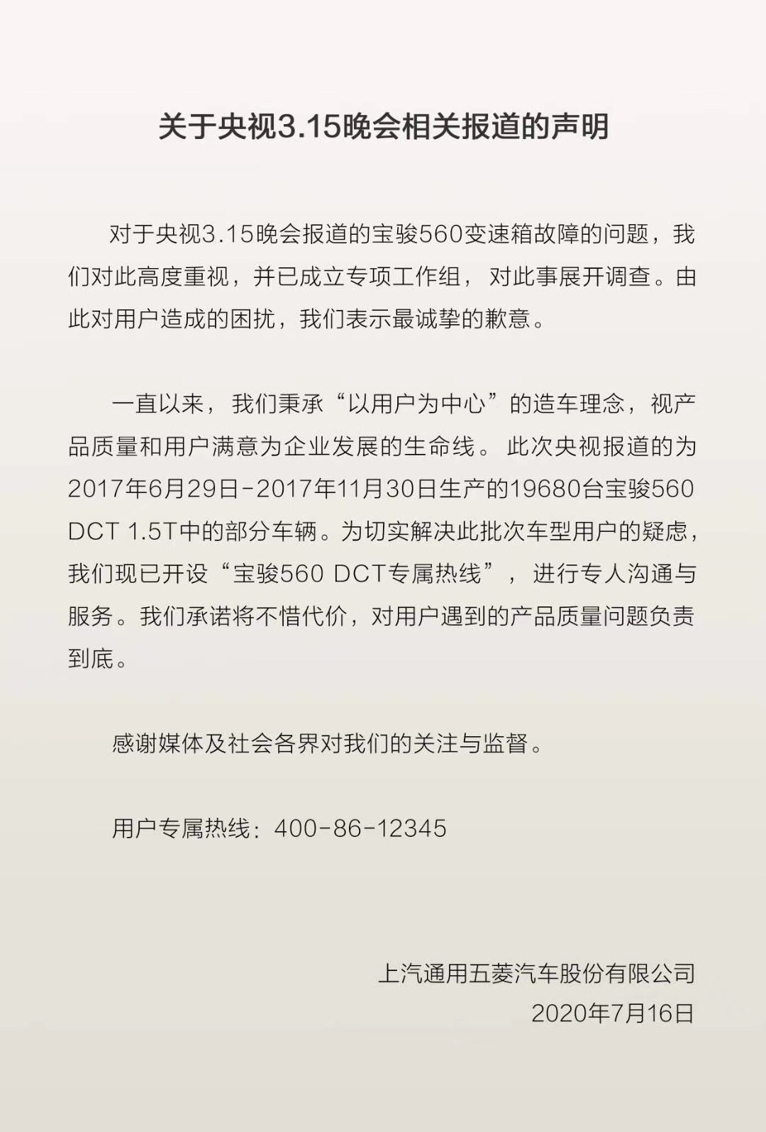 原本的315晚会延期至昨晚在央视财经频道播出,其中宝骏旗下已经停产的560车型因变速箱故障遭点名。针对提到的问题,相关负责人表示:目前已经第一时间成立了专项工作组,对此事展开调查,后续进展会在官方微信和微博进行公布。早在2016年8月,宝骏就曾经召回部分2016款宝骏560汽车,共计12485辆,原因是:其变速箱传感器线束接插件端子在特定条件下可能接触不良,极端情况下变速箱控制模块(TCM)故障灯点亮,车辆进入空档行驶,存在安全隐患;厂家为召回的车辆免费更换TCM线束和TCM模块。本次宝骏的回应速度较快,态度友好,而且出现问题的车型已经停产,对于新款车型影响不大,非2016款宝骏560用户不必担心。