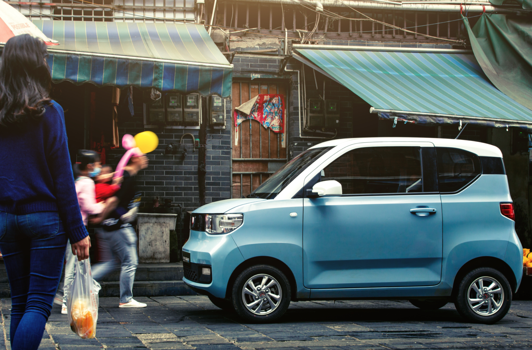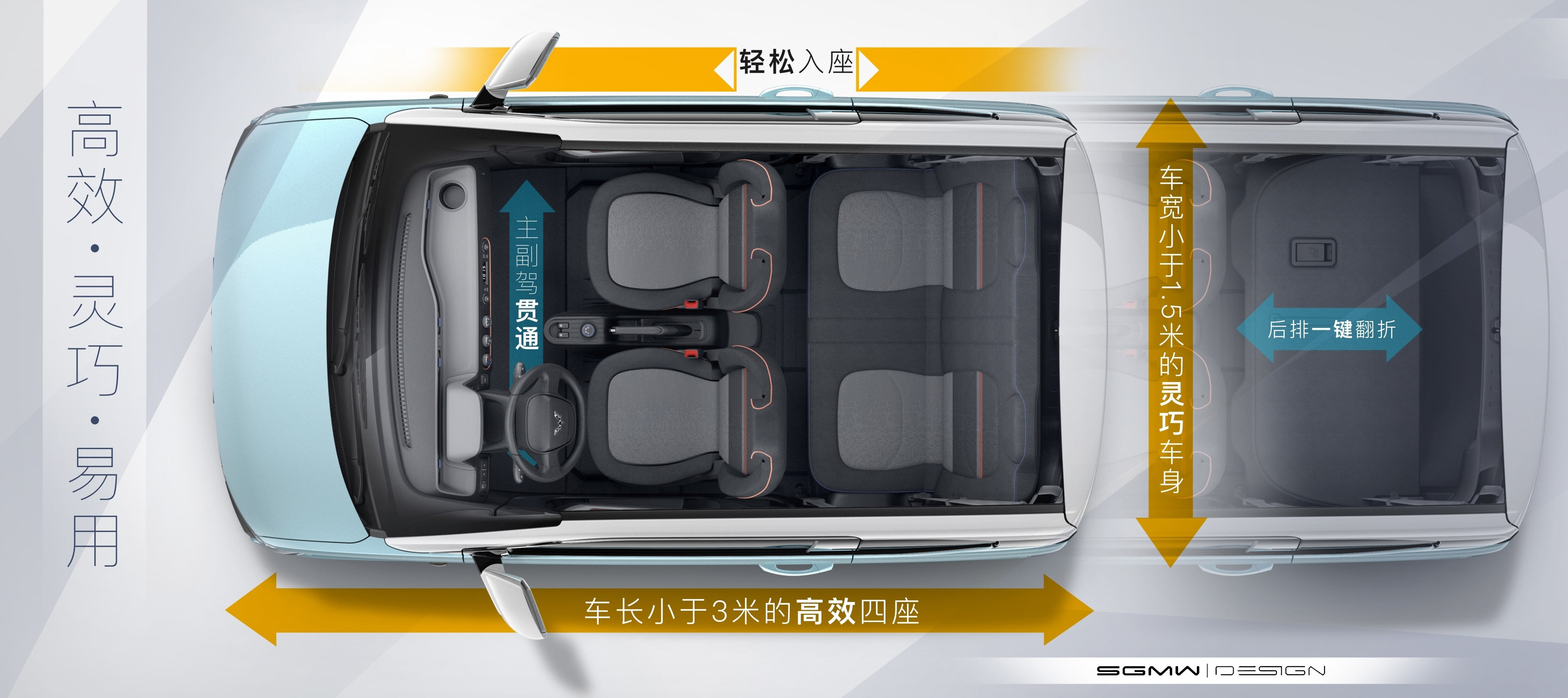 宏光MINI EV的设计理念主打小巧、精致、方便、设计简洁,并且在有限的空间中追求极致的空间实用性,尽可能最大可能缩短前悬和后悬,在不到3米的车长内,塞下了4张座椅。