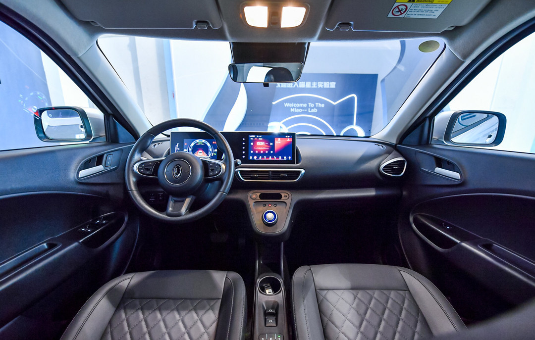 无论是双圆桶仪表盘还是圆形的空调出风口,欧拉黑猫的内饰都采用了不少“萌”的元素,配合中控台上倒圆角液晶屏,再次为新车的简约风格点题。