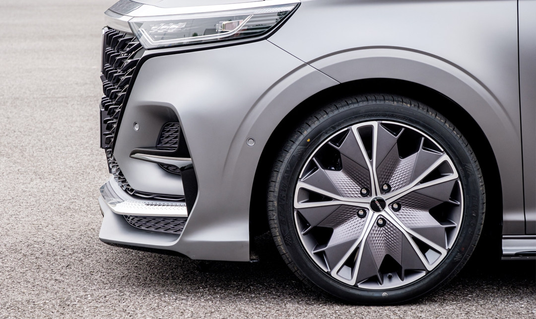 下腰线则从前轮拱处延伸到后轮拱,夸张地展现了车身腰线的张力。此外,B柱和C柱的地方还进行了熏黑处理工艺,营造出悬浮式车顶的效果。
