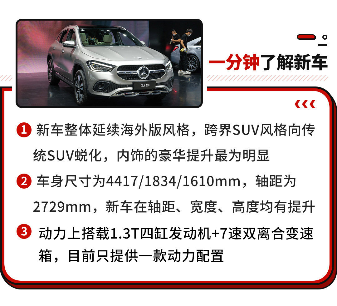 在动力方面上,新车也是大刀阔斧,跟奔驰A级、奔驰GLB搭载1.3T高功率发动机+7速双离合变速箱的相同动力总成,目前还没有2.0T的动力信息,尚且不知道后期会不会追加。新车取消了1.6T发动机,让1.3T发动动机用在尺寸更小的SUV车型上,也许消费者对此接受度也会更高一些。
