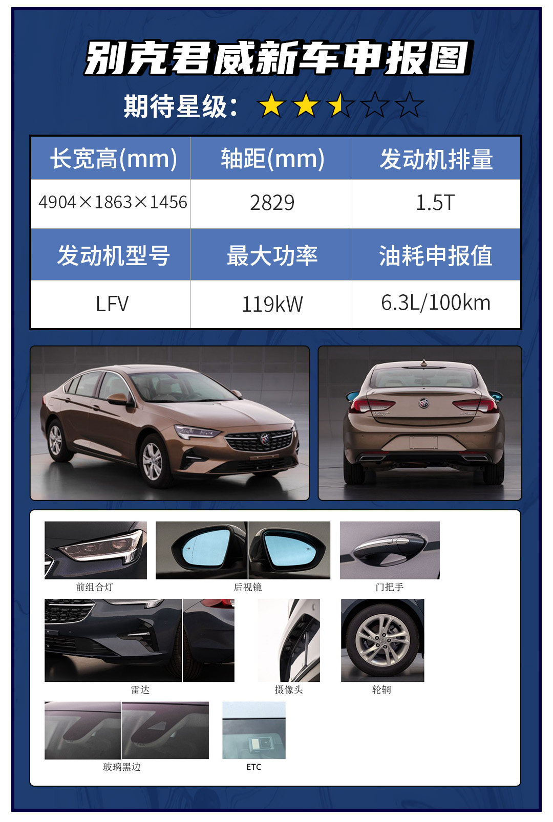 从君威的申报图来看,新车有着全新的造型,尤其在前脸较为明显,中网由点阵式造型构成,整体造型方面可以参考君威GS版本。动力核心上依然搭载1.5T四缸发动机,而不是之前网传的三缸发动机,其动力参数基本与现款车型一致。至于内饰方面,教授猜测也是小幅度的优化。比较贴心的是,新车原厂就已经配备了车载ETC,免去了消费者在后期的加装烦恼。