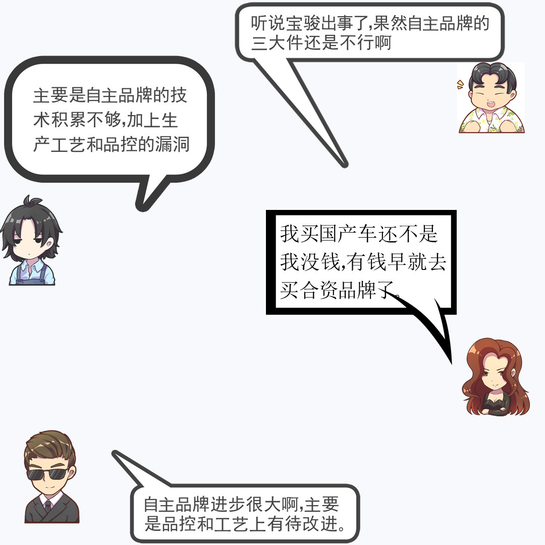 再者,就是今年315晚会所曝光的宝骏510的变速箱问题,一款低端自动变速箱的技术都还没搞懂,或者是相关软件技术匹配没做好,耐久性测试都不知道有没有做,品控上的把控也有待改进。所以,一款国产自主品牌汽车的质量往往代表着一个品牌的口碑,形象和品牌风评。