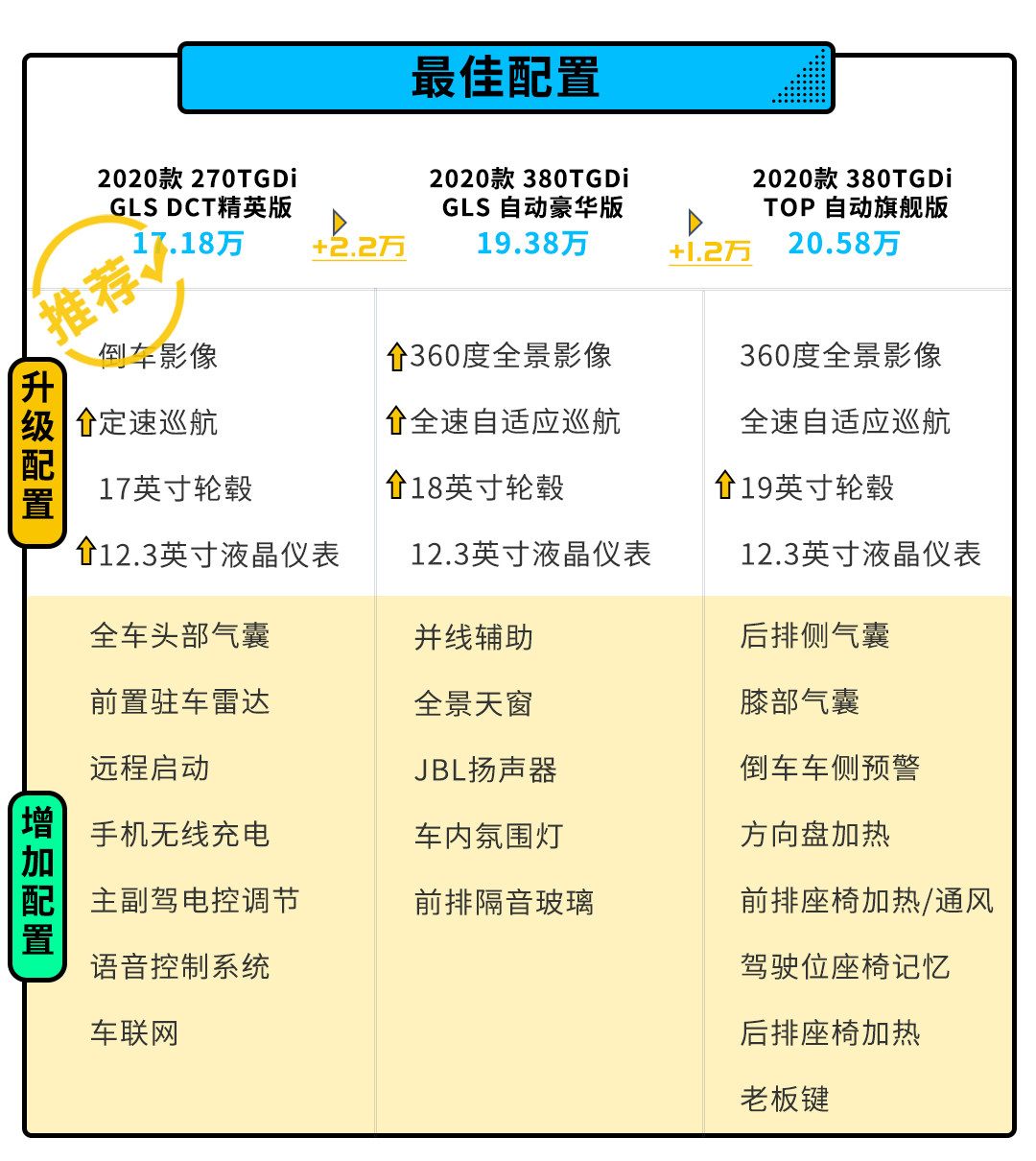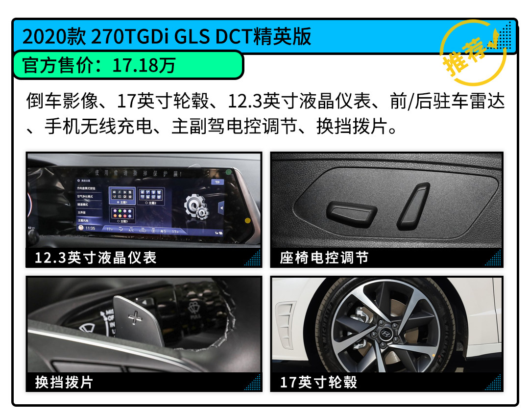 其实就实用性来说,270TGDi GLS DCT精英版就已经能够满足日常驾驶所需的动力、功能性等方面,虽然后续两个版本都有更高的配置提升,但如果只追求性价比最大化的话精英版是最适合的版本。不过对于一辆接近5米的车型而言,17英寸的轮毂难免有些太小气了,如果能够升级到18英寸甚至是19英寸或者会与整车比例更为协调。