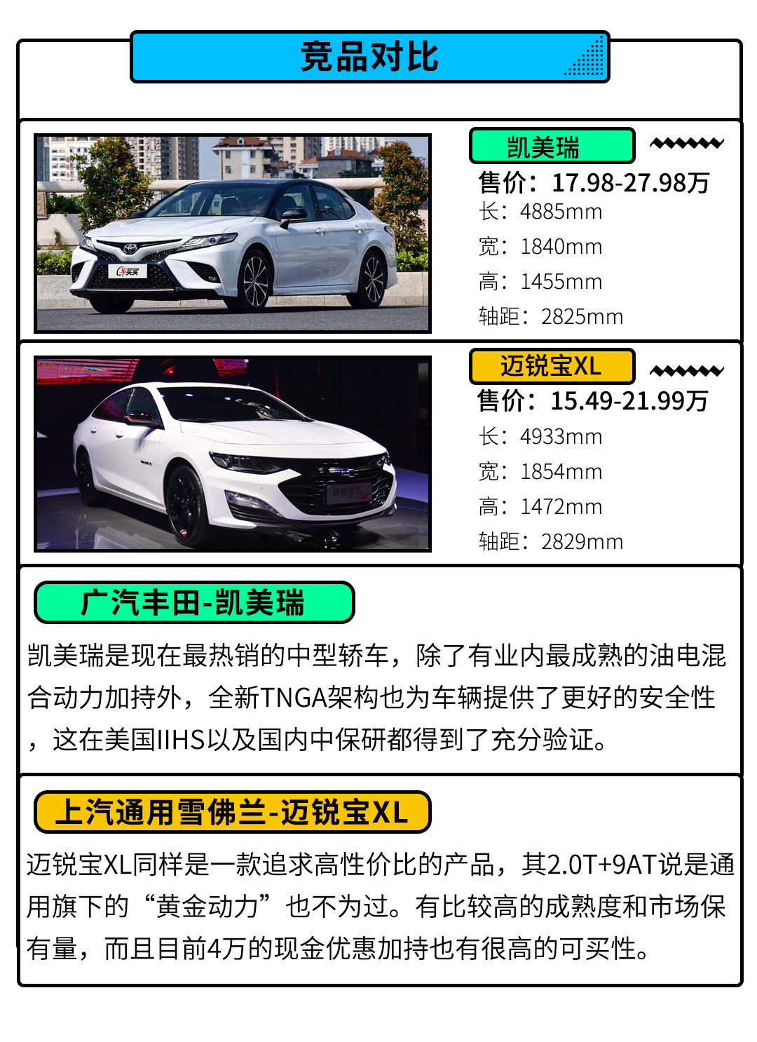 对比凯美瑞而言,索纳塔最大的优势还是在于性价比方面,更大的车身尺寸和更高的配置涵盖给了索纳塔更强的实用性;并且不排除后期会有不错的优惠加持。而与迈锐宝XL对比,索纳塔搭载的全新1.5T发动机对比1.3T三缸发动机有市场接受度更高,动力更强的优势,就两车入门版而言,买买君100%推荐全新索纳塔。