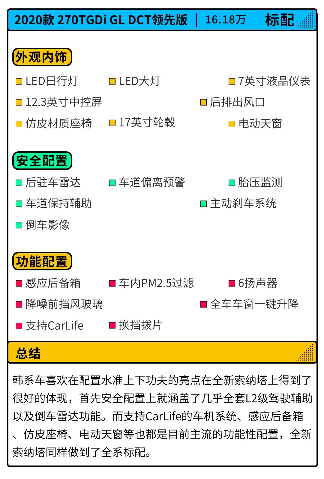 其实就车身尺寸而言,全新索纳塔完全有能力对飚亚洲龙和君越,但是就售价来说,甚至能够做到比凯美瑞、雅阁等标准中型车更低的门槛。