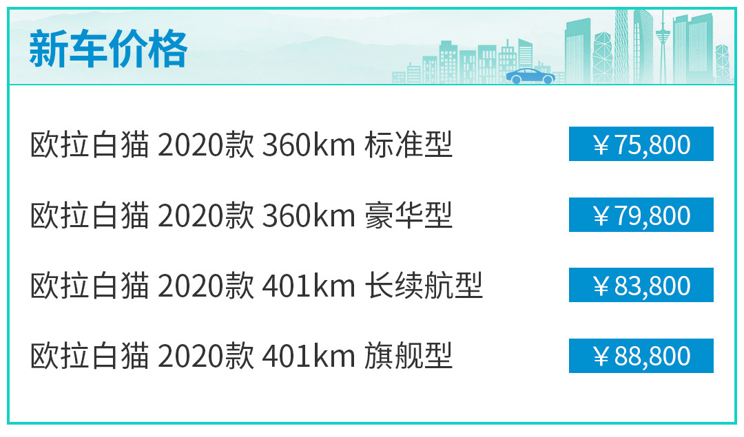 欧拉白猫在7月15日就已经上市,指导价为7.58-8.88万元,共推出四款车型、两个续航版本,分别为360km和401km。