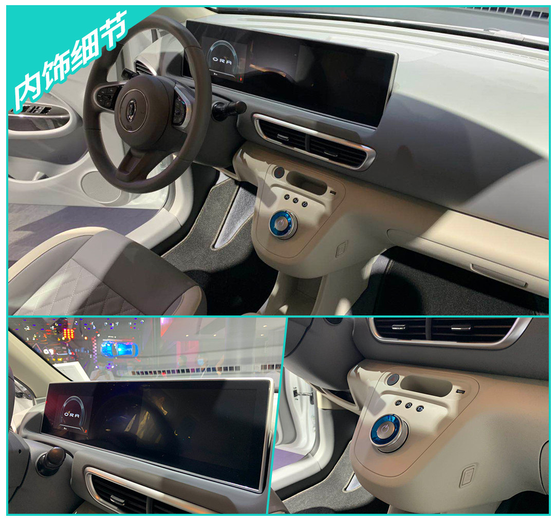 内饰部分,第一眼是简约,细看是个性,先从配色上来看欧拉白猫就有多种的颜色,欧拉白猫在内饰上提供八种颜色的搭配,可谓是将个性贯彻到底。不过在用料上就不要有多大的期望,基本上都是硬塑料材质,不过摸起来并不廉价。两块屏幕加起来达到了23英寸,是车内最大的亮点,显示效果清晰,内部则以一些常用功能为主。