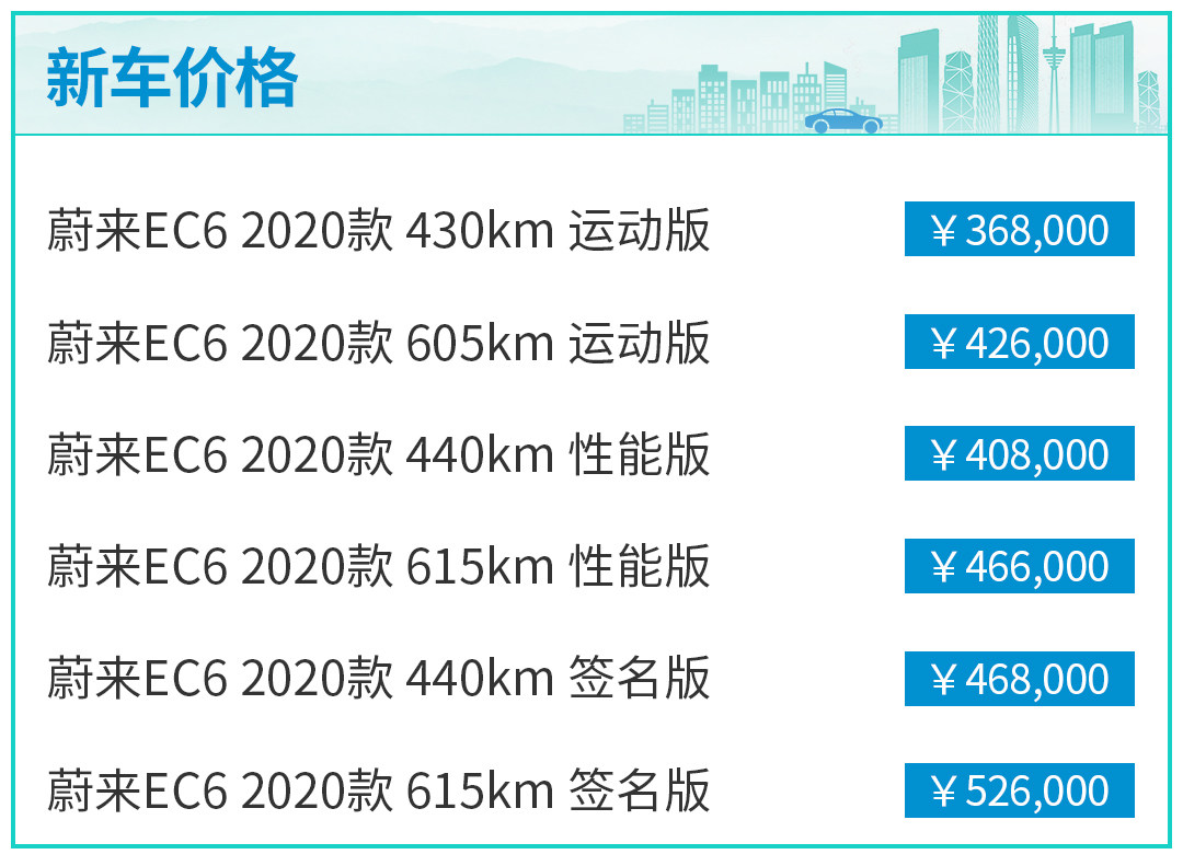 动力方面,EC6推出三种性能,三个版本:运动版、性能版、签名版。运动版车型采用最大功率160kW的前永磁同步电机和后异步感应电机,性能版和签名版采用前永磁同步电机(最大功率160kW)+后异步感应电机(最大功率240kW)的形式。电池容量方面,用户除了可以选择容量为70kWh的电池包以外,还能选择容量为100kWh的电池包,最终能搭配出四种NEDC续航里程:430km、440km、605km、615km。