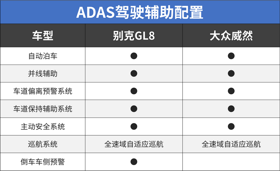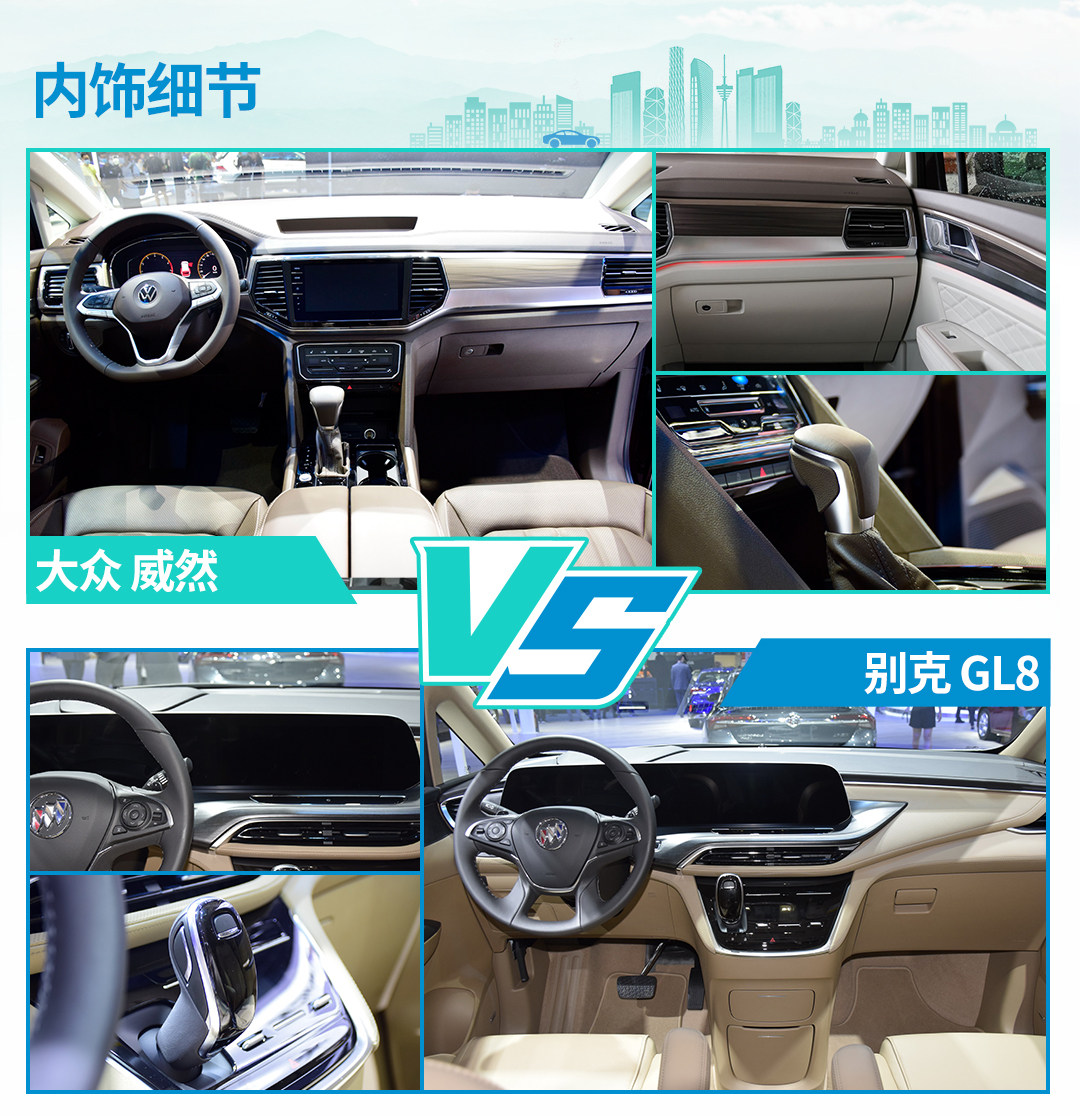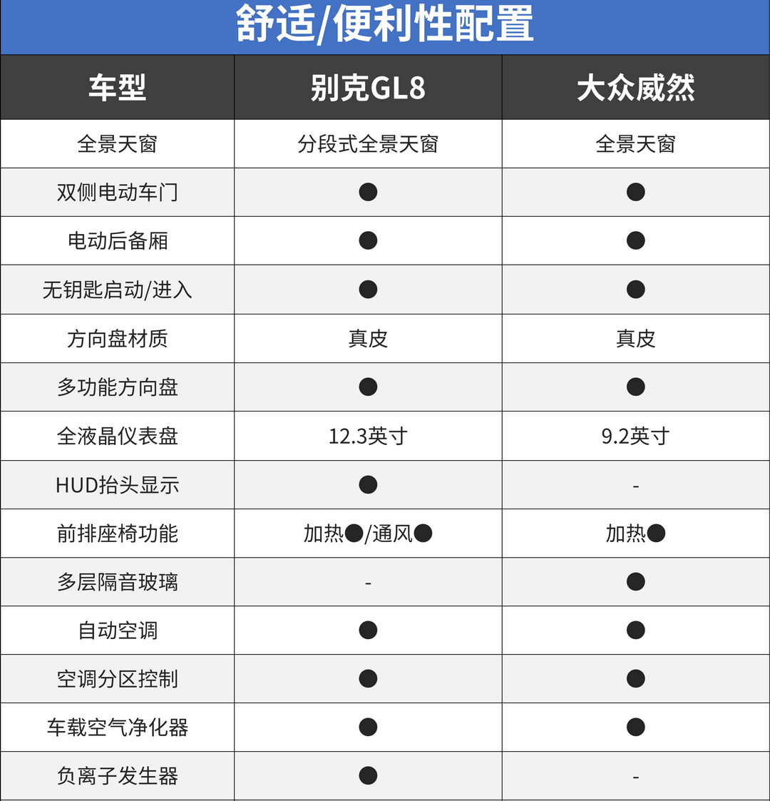 在舒适性和便利性方面,两者同样出色,都配备了自动分区空调、车载空气净化器、双侧电滑门、全景天窗和电动后备厢。别克GL8的配置多了HUD抬头显示,而大众威然则配备了全车隔音玻璃。
