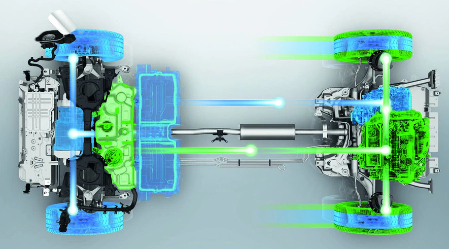图中蓝色部分代表电驱系统,绿色代表汽油驱动系统,C5天逸 PHEV 前后桥均配备驱动电机,前电机集成在爱信8AT变速箱内,前桥驱动电机最大功率81kW,峰值扭矩320N·m,后桥驱动电机最大功率83kW,峰值扭矩166N·m。电池容量为13kW,纯电行驶里程为58公里。