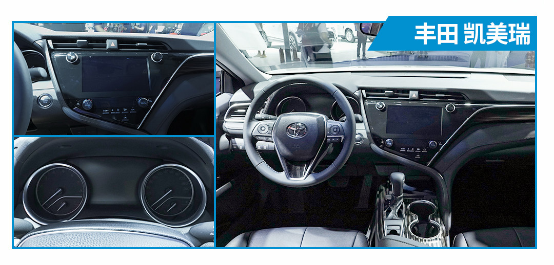 至于丰田凯美瑞,“Y”字形线条为中控台进行了“功能分区”,在金属装饰条和拼色皮革、软塑包裹的帮助下,也使凯美瑞的中控台获得十分鲜明的层次感。可惜的是中控液晶屏界面设计不够前卫,使内饰科技感稍微逊色于全新索纳塔。