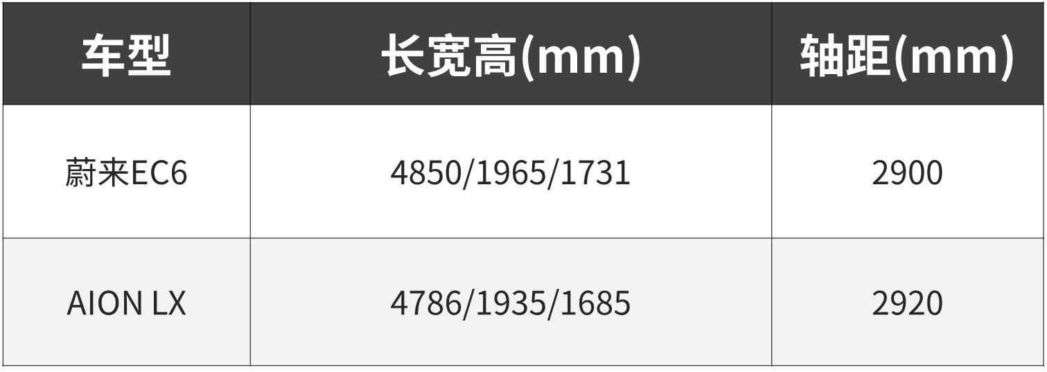 车身尺寸上,蔚来EC6的长宽高为4850/1965/1731mm,轴距为2900mm。而Aion LX的长宽高为4786/1935/1685mm,轴距为2920mm。Aion LX虽然车长比起蔚来EC6要短上不少,但由于车头较短的缘故,因此腾出了大量空间给车身。