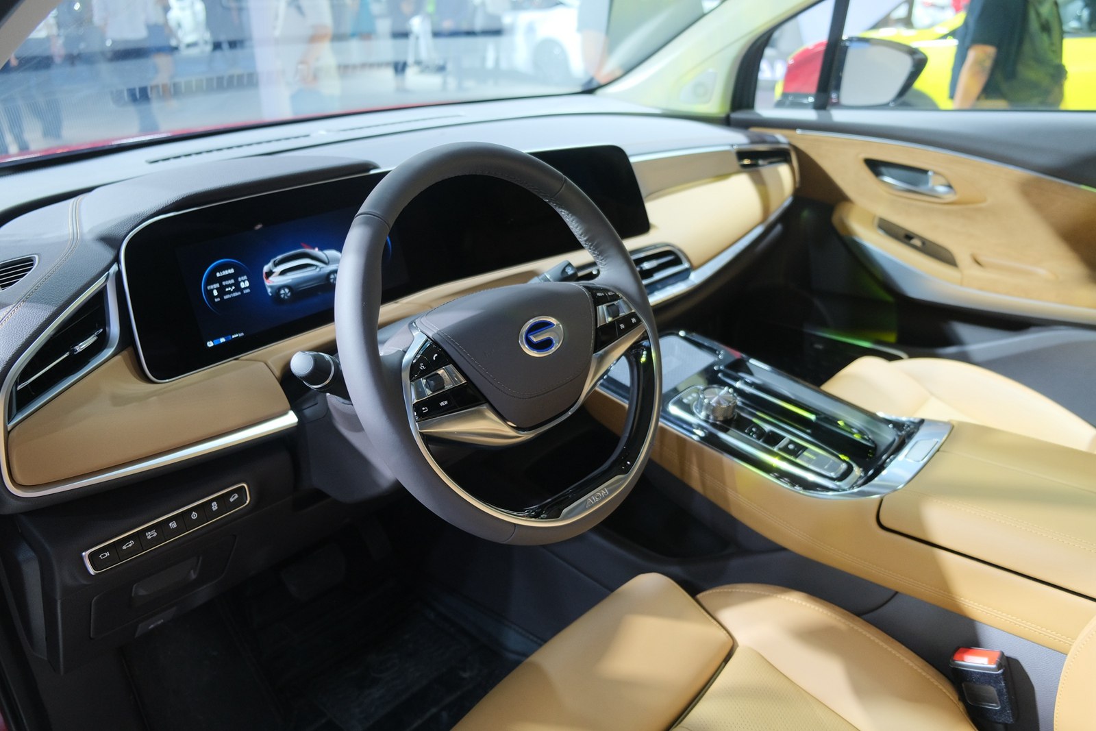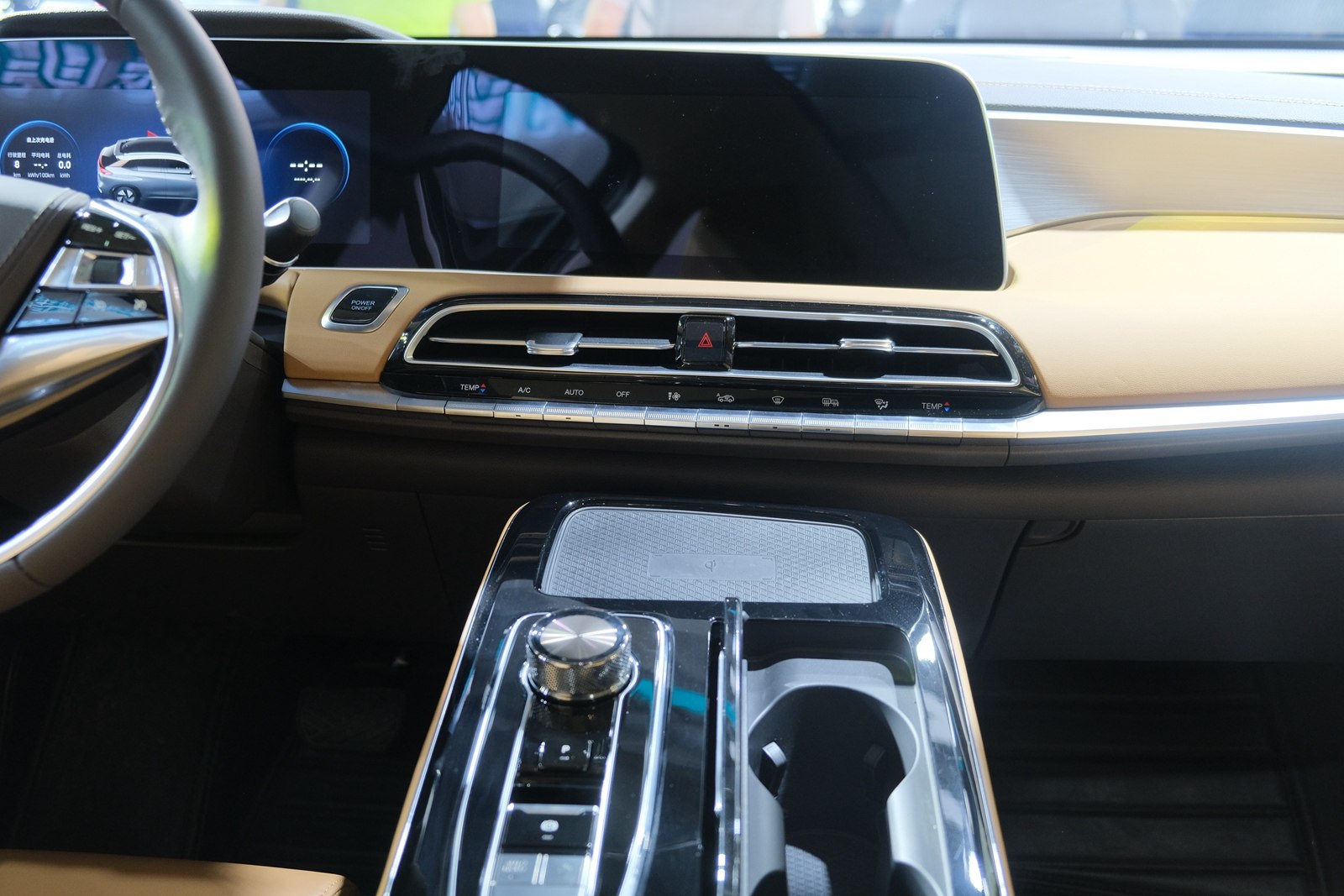 相比于蔚来EC6,Aion LX的设计并没有过度追求简洁与科技感,而是在豪华感上更下功夫。中控台采用深灰色的大面积软质材料,银色哑光镀铬饰条、亮黑漆面板等材质搭配到一块。不仅触感上出色,而且看上去层次感分明,非常显档次。