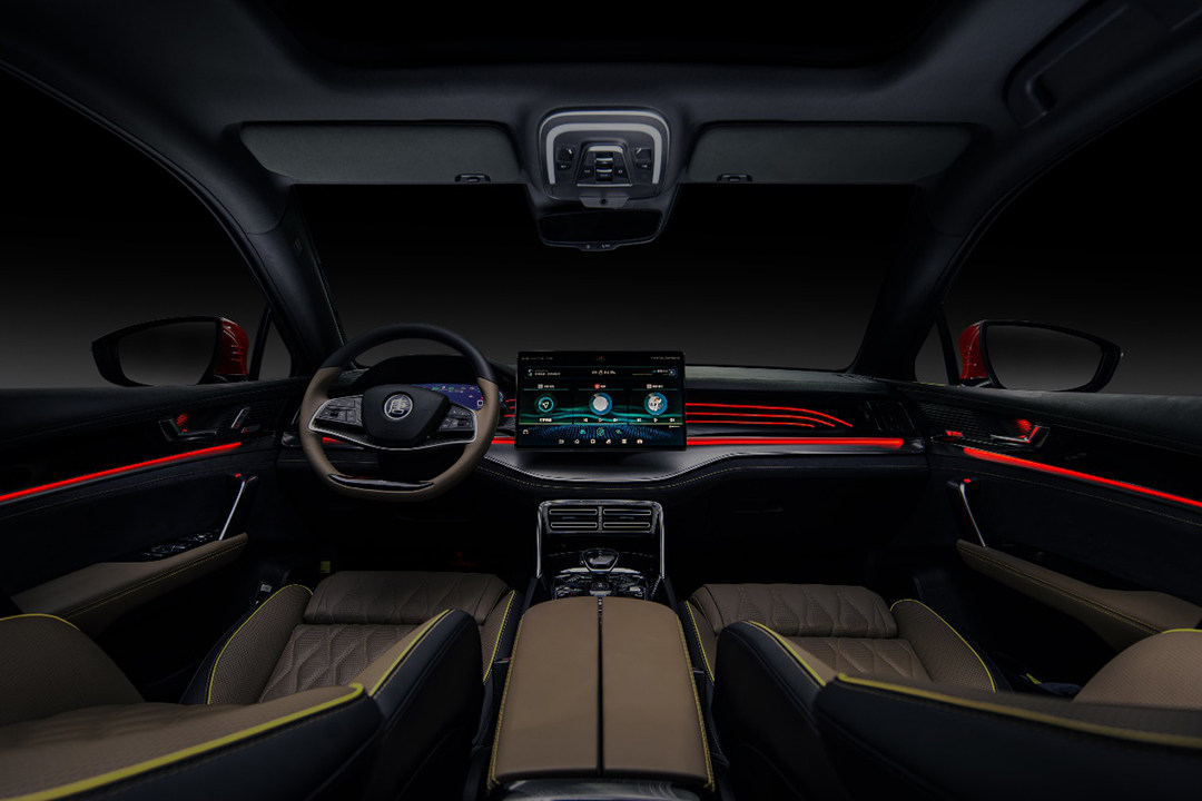 座舱以中国古典建筑为灵感,布局大气、层次对称,集格调感、恢宏感于一体。 Ultrasuede®超纤高档类麂皮面料,环抱而行,2mm精奢双色缝线,至臻质感堪比百万级豪车;龙爪之痕数字面板极具个性,加之31色交互式智能座舱氛围灯,科技感十足,堪称整车点睛之笔;龙鳞纹豪华真皮座椅,根据人体工学全新开发,更贴合亚洲人的身体曲线,加上高难度数码冲孔压线工艺,舒适性、豪华感双一流。