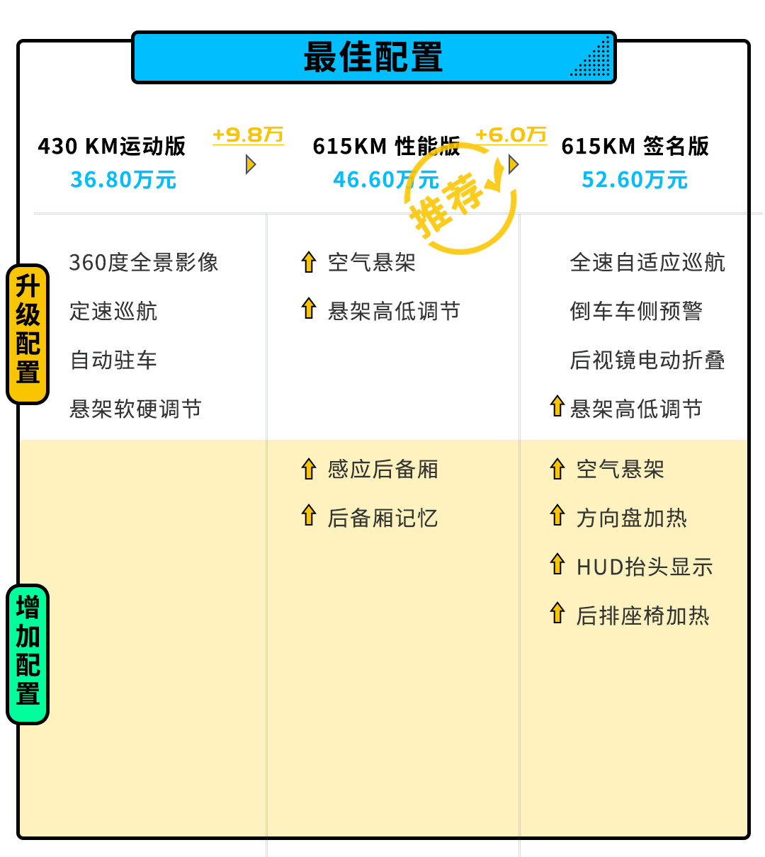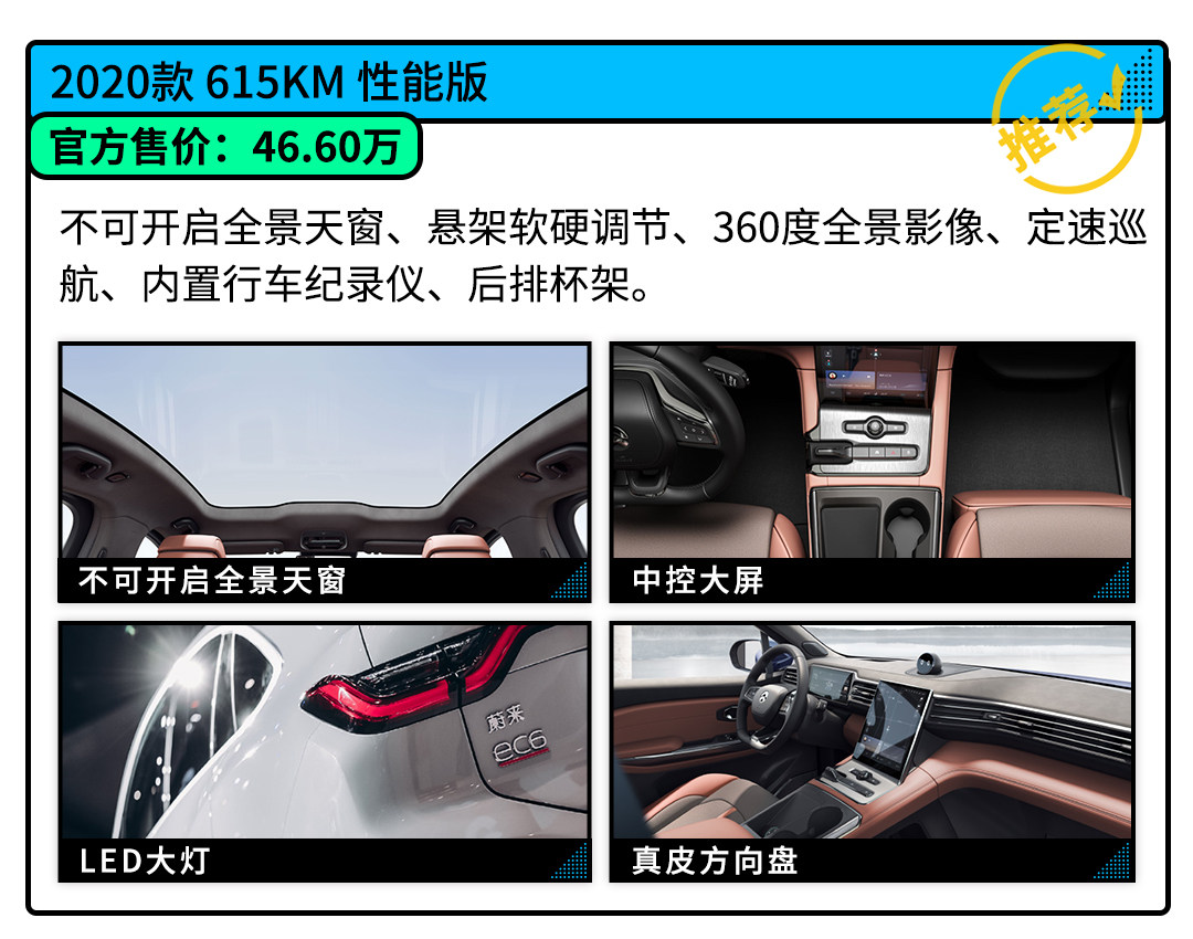 所以买买君更推荐615KM 性能版,不仅在配置上有所增加,性能版所独有的悬架高低调节对于操控的体验提升也是极为明显的,再看价格相比顶配也要便宜6万元,确实是最性价比的选择。