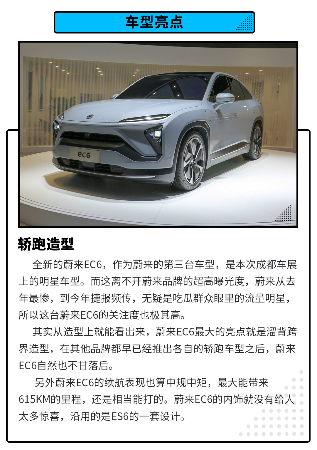 而蔚来EC6填补了轿跑SUV的空白,同时也扩大了蔚来的产品线,消费者不再只纠结于选ES6还是ES8,而要开始多纠结要不要选新上市的轿跑SUV EC6了。