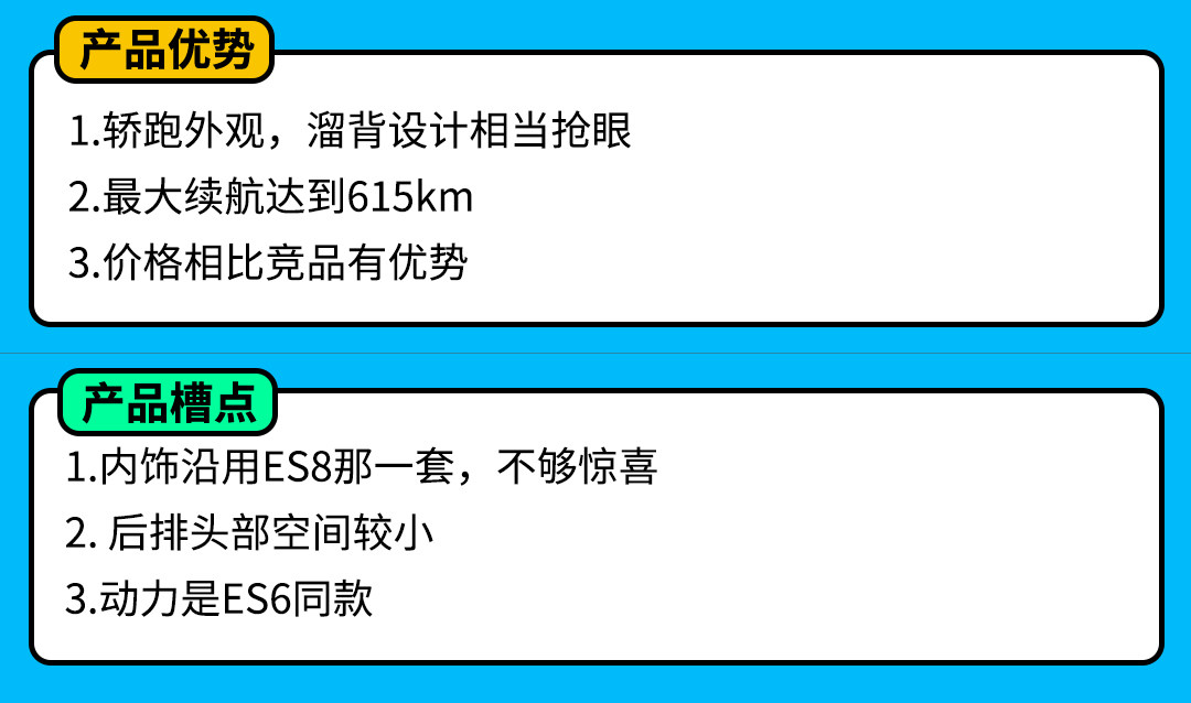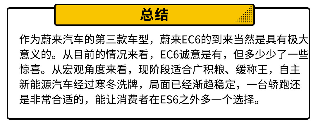 事实上纯电轿跑SUV,蔚来EC6可以算是一个新品种,在特斯拉Model Y还未正式上市之前,蔚来EC6可以独享一段时间的市场空白期。从产品力上来说,蔚来EC6不惊艳,但足够诚意,相比蔚来ES6起售价也仅提高1万元,要啥自行车啊。