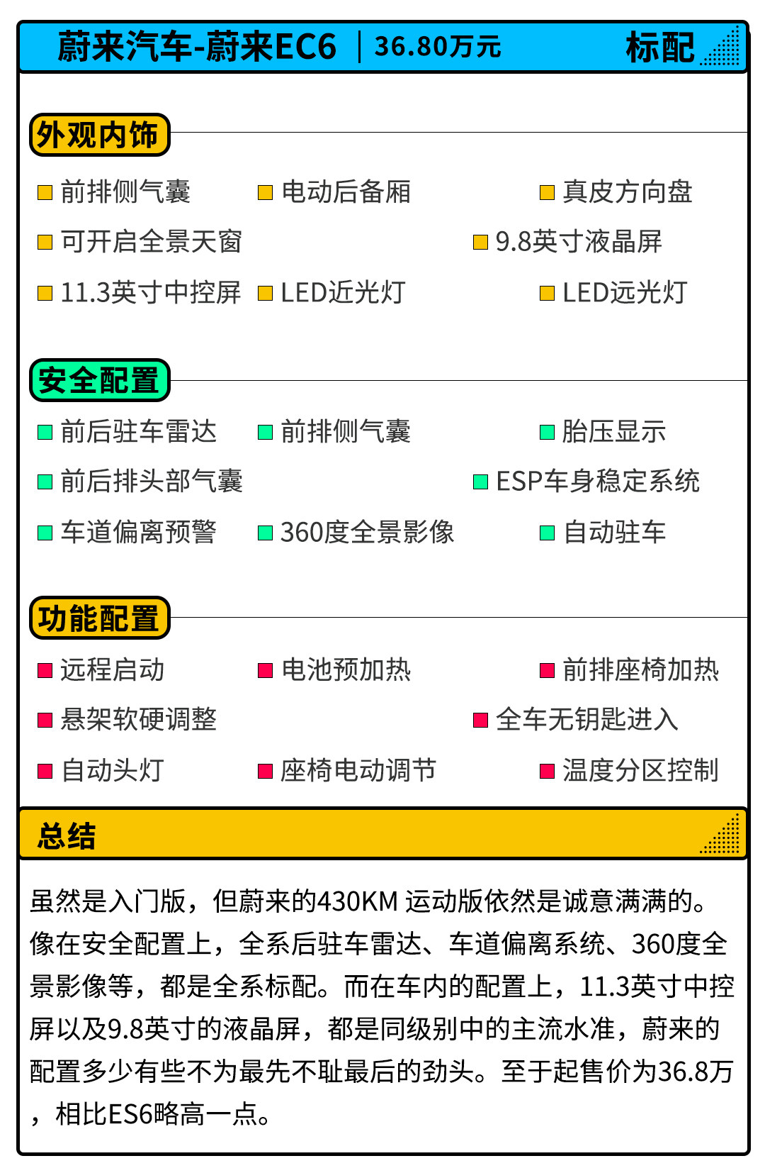 其实说起来蔚来的最低配430KM性能版的配置相当良心,像胎压显示、车道偏离预警、360度全景影像以及定速巡航等,全系标配确实值得36.8万的起售价,但在现在新能源最高都达到700km的续航情况下,430公里的续航不太够看。