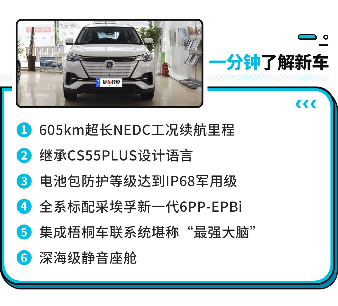 在车主最关心的续航和电池容量参数上,CS55纯电车型搭载了一款最大功率160kW,峰值扭矩300N·m的同步电机,配备了能量密度为160Wh/kg、容量84.2kWh的动力电池组,NEDC续航里程达到605km。