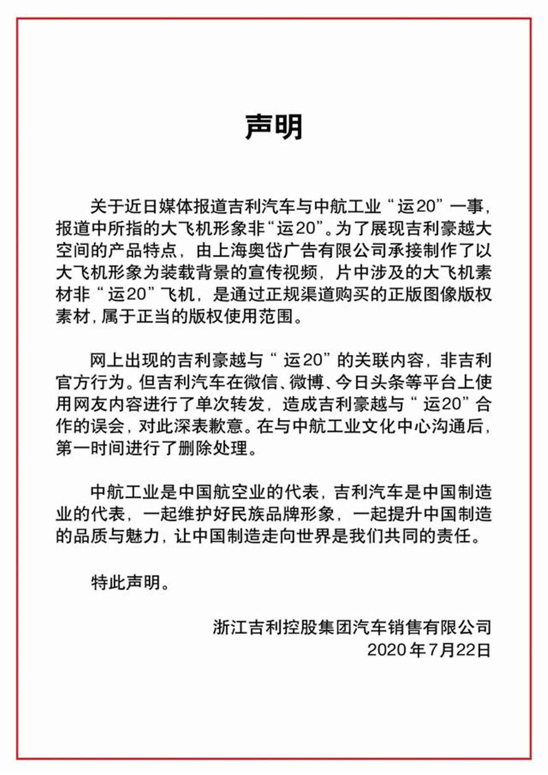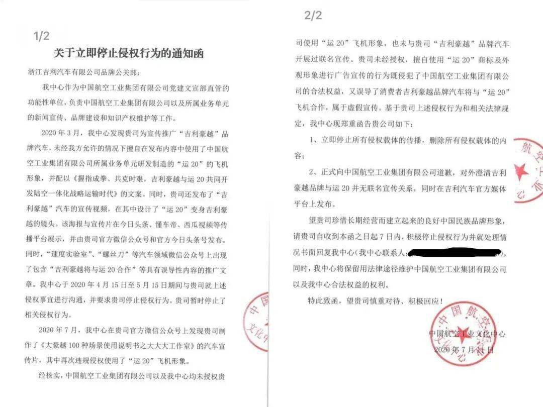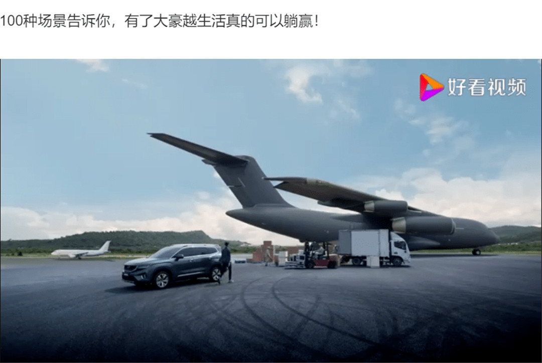 于是便出现了前文的“一纸诉讼”,而随后吉利方面却以视频中大飞机形象并非“运20”的说明,对此事进行了解释;而之前宣传中出现的“运20”字样,更是以一句轻飘飘的“非官方行为”带过;