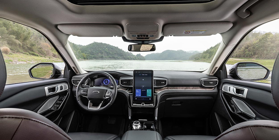 探险者的内饰相对比较偏于传统,不过12.8英寸的中控大屏带来不少的科技感,而且车内几乎所有功能都集成在这块大屏之上,因而车内并没有太多的物理按键,整体看上去科技感还是有的。