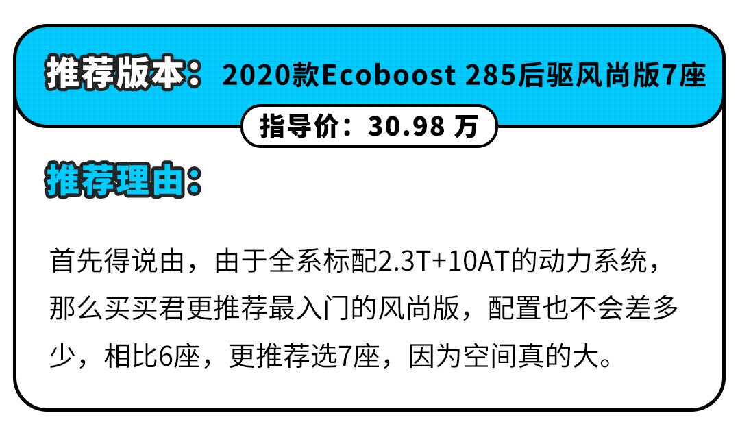 因为探险者全系并没有优惠,所以买买君更推荐后驱风尚版。该有的配置并不少,同时也能享受到四驱带来的操控感,这无疑是最具性价比的选择。