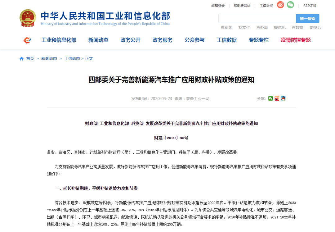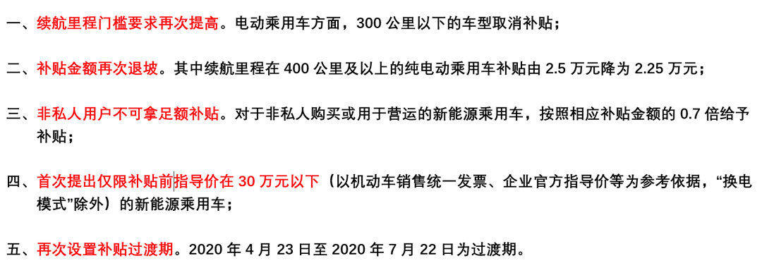 早在今年4月,四部委联合发布2020年新能源补贴政策,补贴延长到2022年的同时还制定30万元新能源车型的补贴门槛,并设定了从4月23日至7月22日为期3个月的过渡期。