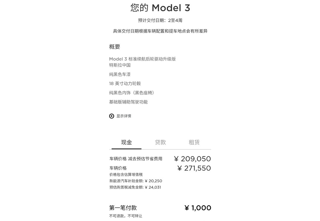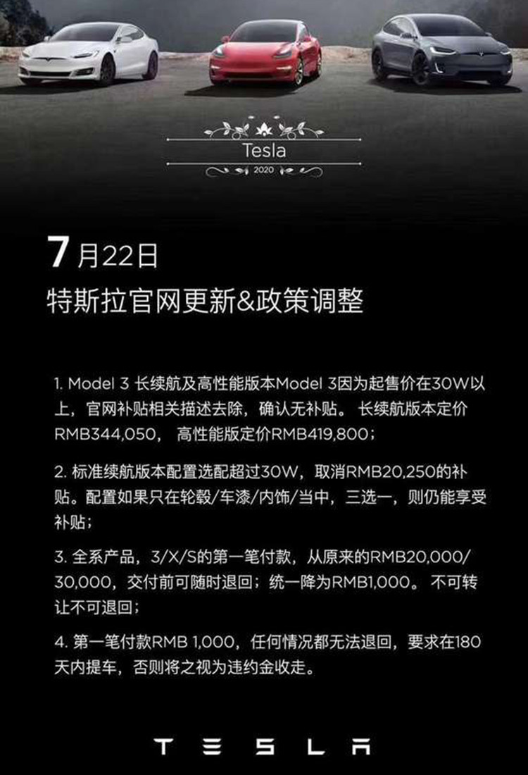 此外,特斯拉还对旗下全系车型的预定政策进行调整。特斯拉将全系在售产品的第一笔付款,从原来的2万元和3万元统一下调为1000定元。交付定金即可预定车辆,但该定金不可退还、不可转让,且需要在180天内提车,否则将之视为违约金收走。