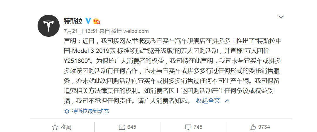 然而,对于这个团购平台发出的活动,作为生产厂商的特斯拉却表示一无所知。2020年7月21日特斯拉发表微博表示,其并没有与相关的网购平台产生过任何销售相关的合作,并在微博中强调,如果消费者因参与该活动产生任何争议或权益受损,特斯拉概不负责。
