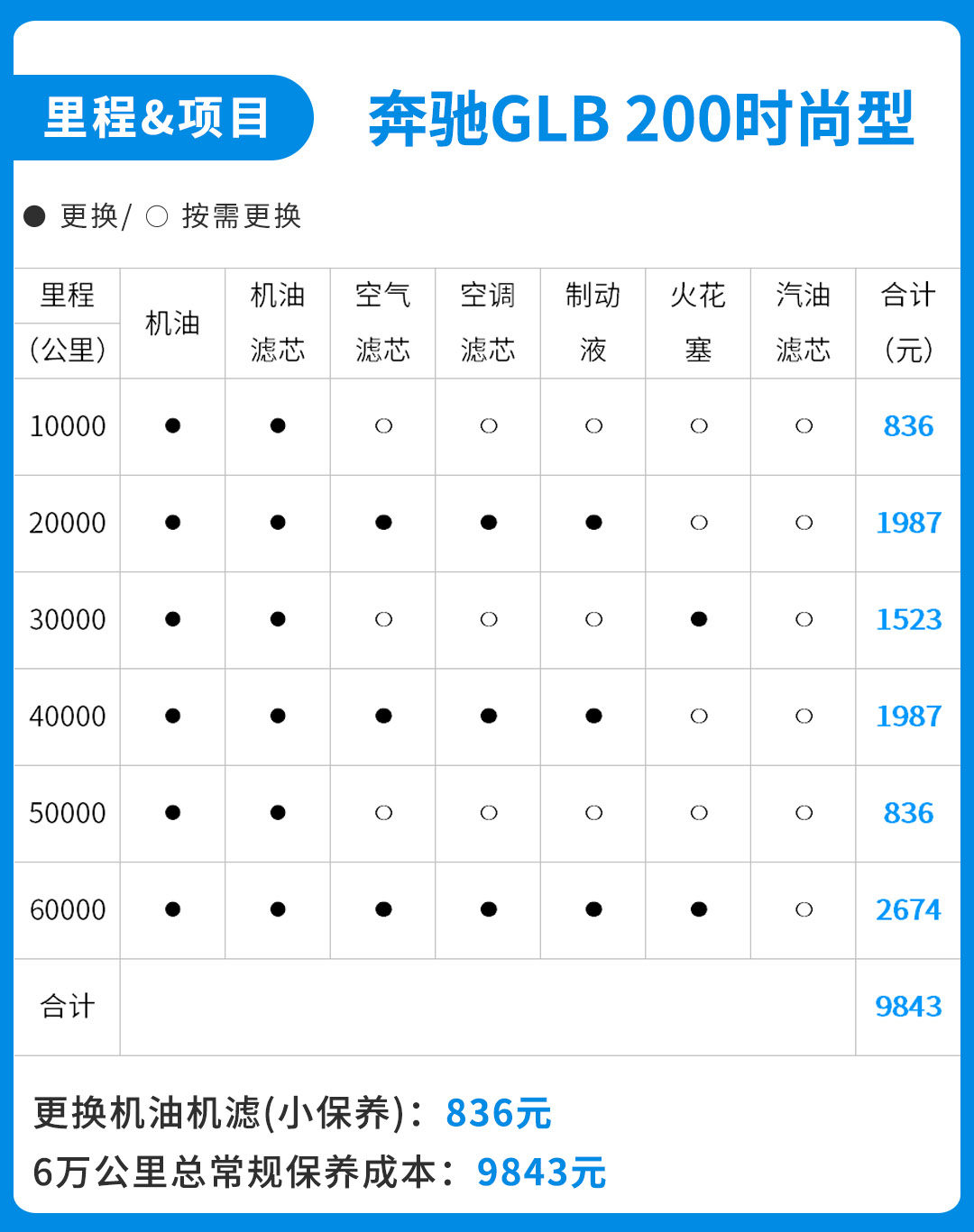 我们以销量较高的奔驰GLB 200动感型为例,根据厂家建议,其保养周期为每6个月或者10000公里一次(以先到者为准),其中更换机油、机滤的小保养费用约836元,2万公里需要更换制动液,保养费用为1987元。