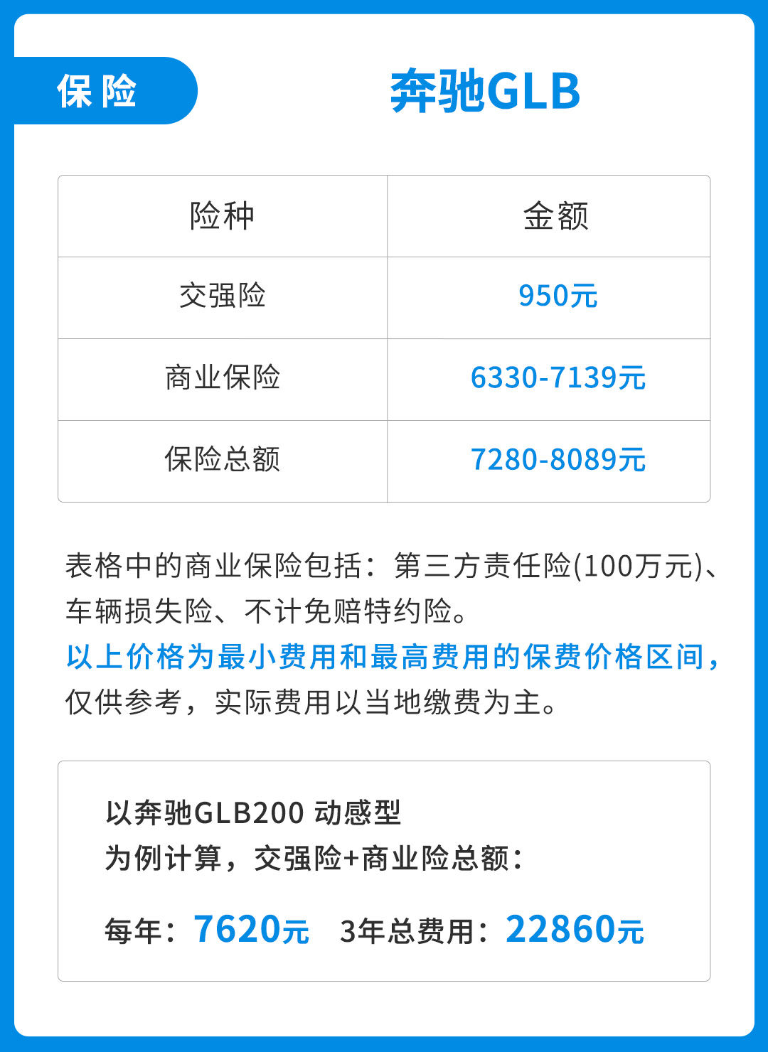 商业险选择第三方责任险(100万)、车损险、不计免赔特约险,以售价31.88万的奔驰GLB 200动感型为例,一年的保险费用约为7620元,每月平均635元。(注:本文的商业险不考虑折扣。)