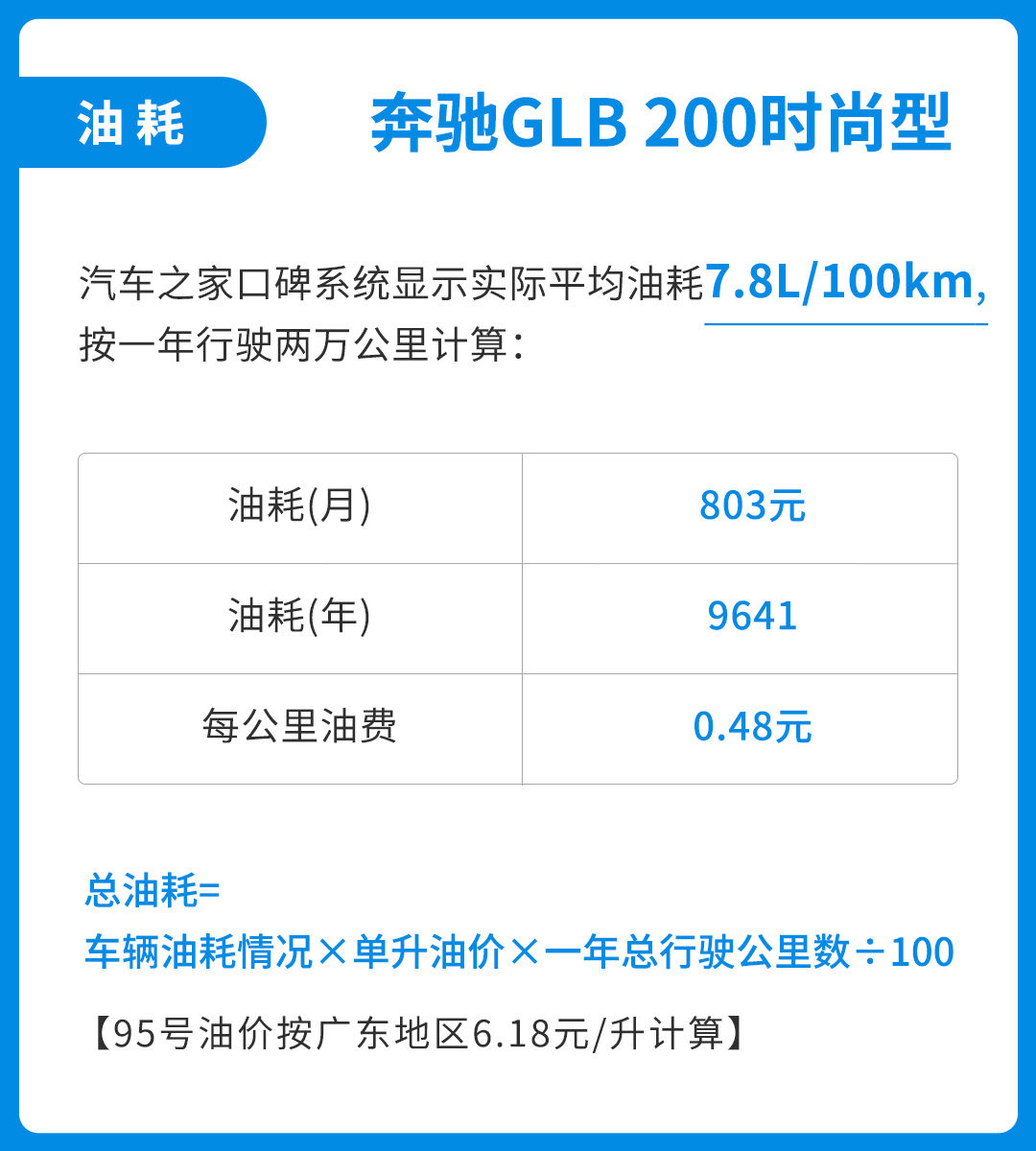 按照目前广东地区95号汽油6.18元/升的价格来算,一年行驶2万公里的总油费约为9641元,每月平均花费约803元,每公里油费0.48元。