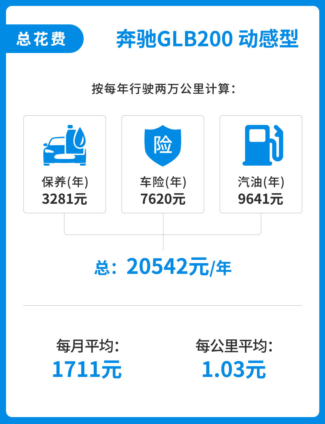 总的来看,按一年行驶2万公里来计算,奔驰GLB 200动感型一年的保养费、保险费和油费分别为3281元、7620和9641元,一年的养车总费用约20542元,每月平均约1711元,每公里平均约1.03元。
