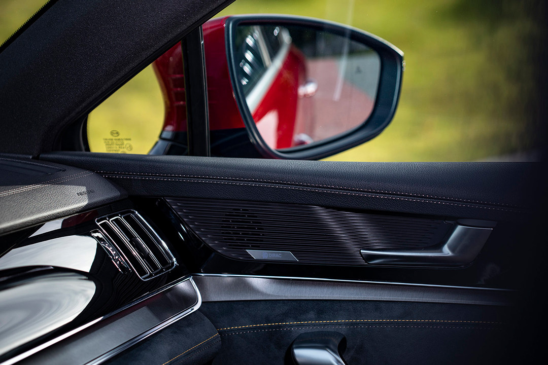来到车侧,初看并没什么改动,22英寸熏黑轮圈、Brembo四活塞制动卡钳、悬浮式车顶如约而至。不过,走进细看,便可以发现主驾驶位一侧的后视镜引入了NFC功能,部分携带这一功能的手机可当车钥匙使用。