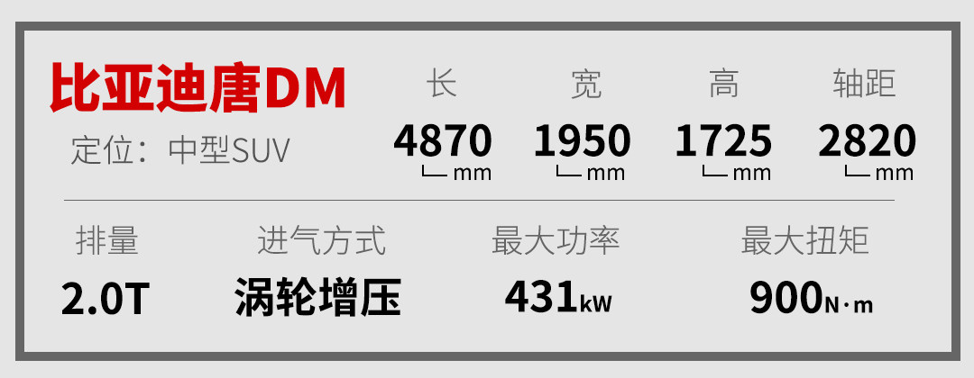 作为改款车型,改款比亚迪唐DM车身尺寸没什么变化,长/宽/高:4870/1950/1725mm,轴距:2820mm,在大部分同级车型里面不算有什么优势,但在设计师和工程师的共同努力下,为唐DM创造出了更多舱内乘坐空间。