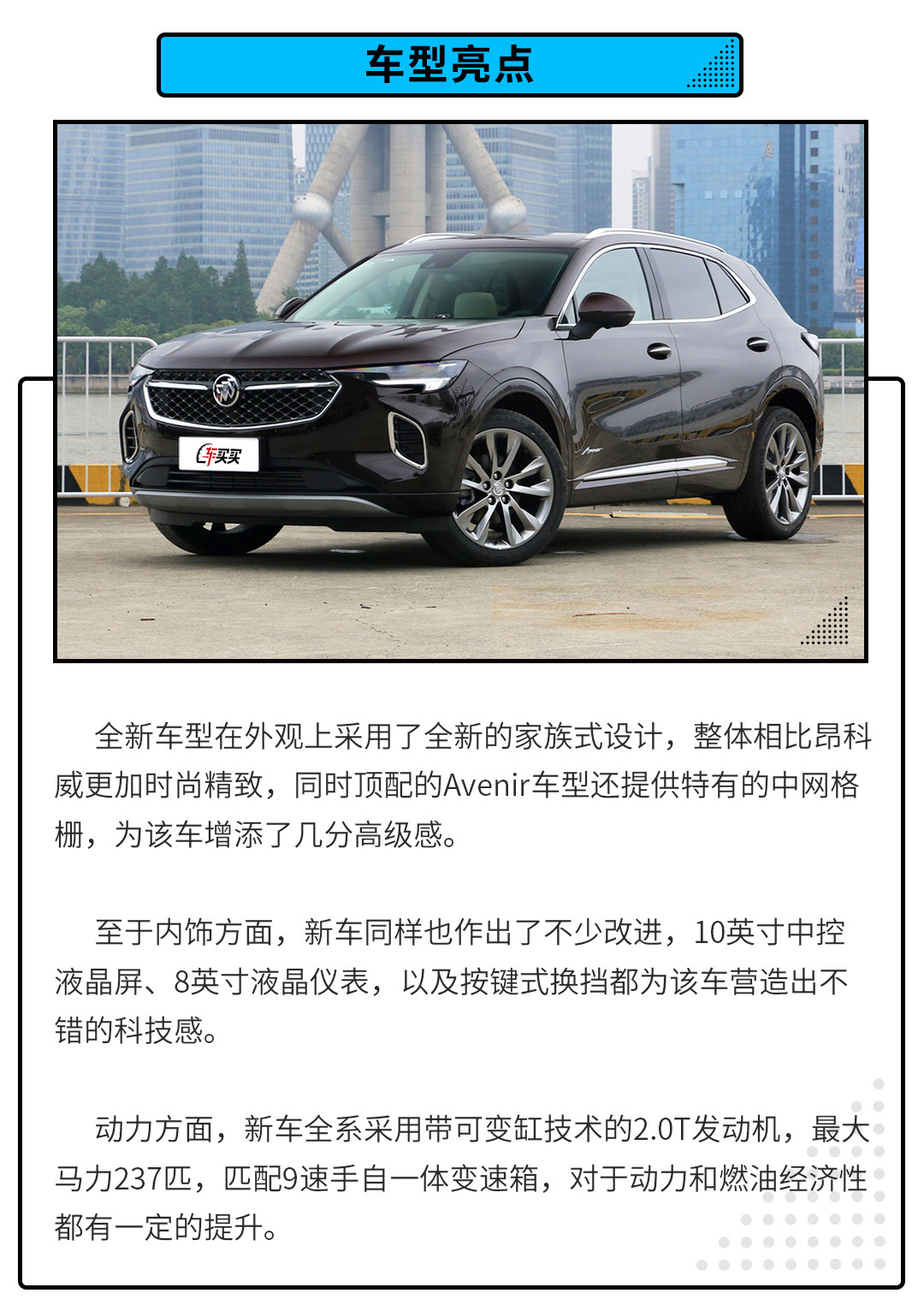 首先这款车在外观上采用了全新的设计,并且根据车型的不同提供两款外观套件,整体相比昂科威看起来更显时尚大气,同时在动力方面采用了通用家族最新的2.0T可变缸发动机,匹配9速手自一体变速箱。