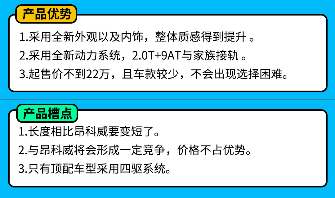 该车在优缺点方面其实还算是明显的,在车身长度以及轴距方面相比昂科威都有所缩减,不过在宽度上则是增加了不少。