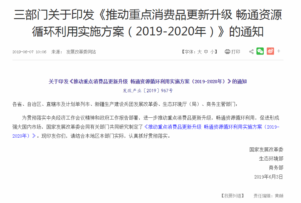 并且,虽然在6月6日,国家发改委、生态环境部、商务部发布《推动重点消费品更新升级畅通资源循环利用实施方案(2019-2020年)》中提到过: