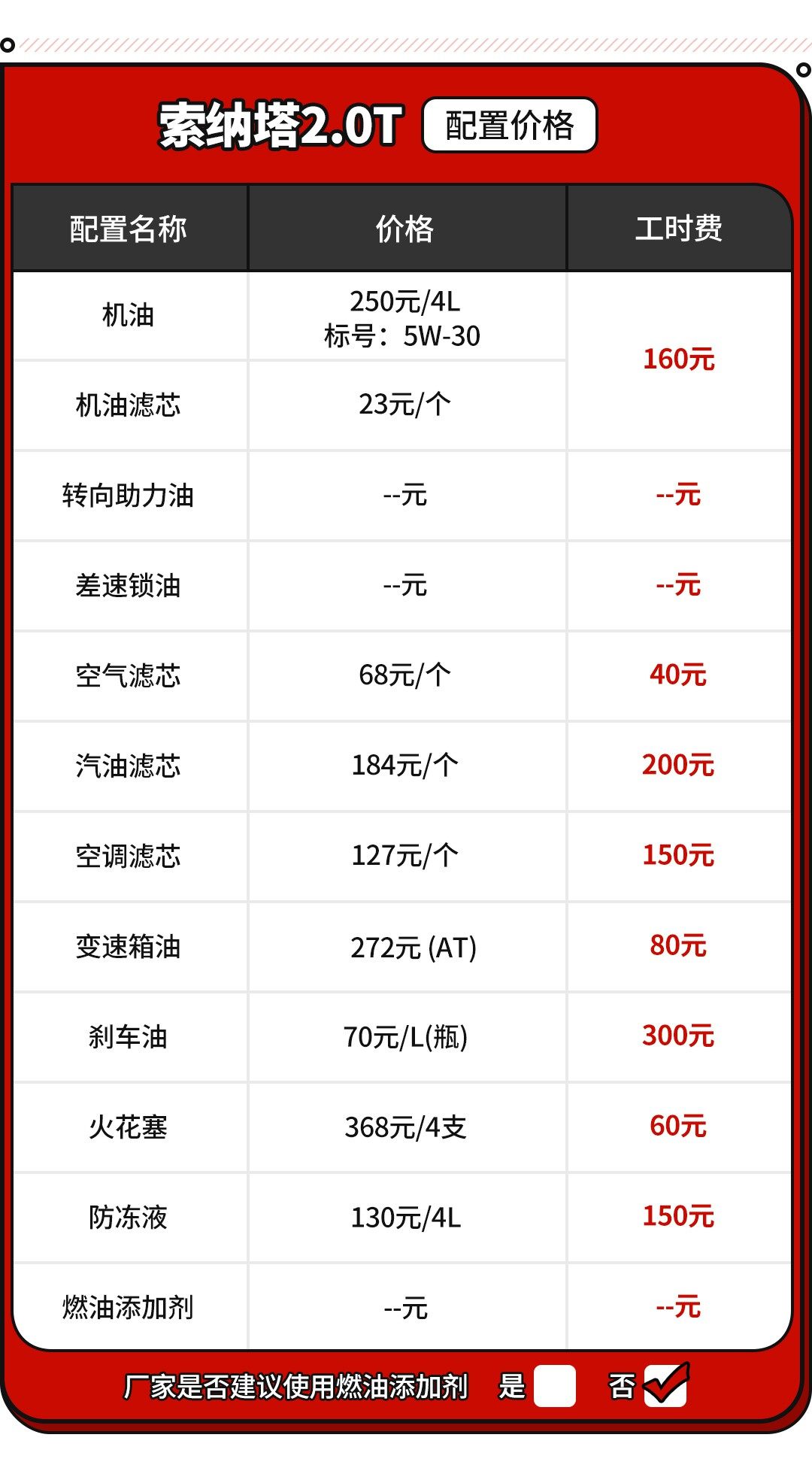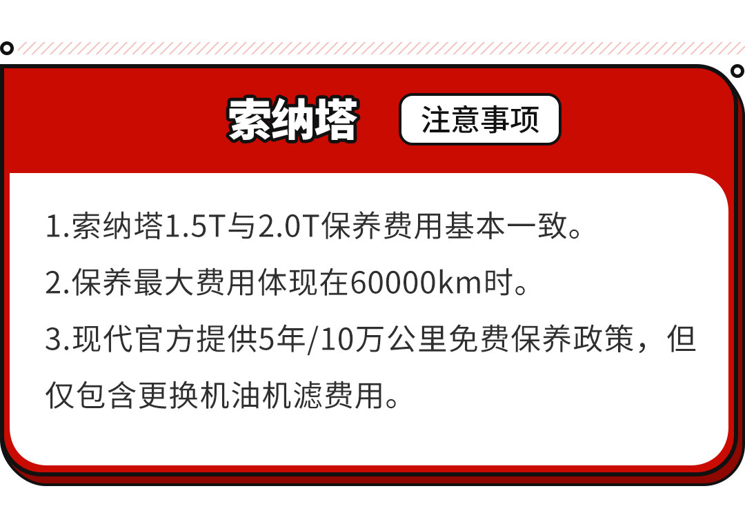 总体来说,全新索纳塔除了在价格方面给到用户惊喜之外,在售后保养方面同样是给到不少惊喜,尤其是前期保养方面实际需要花费的费用并不多,并且2.0T和1.5T在用车价格上也是相差不多,只要预算足够的话购买2.0T车型其实会是个更好的选择。