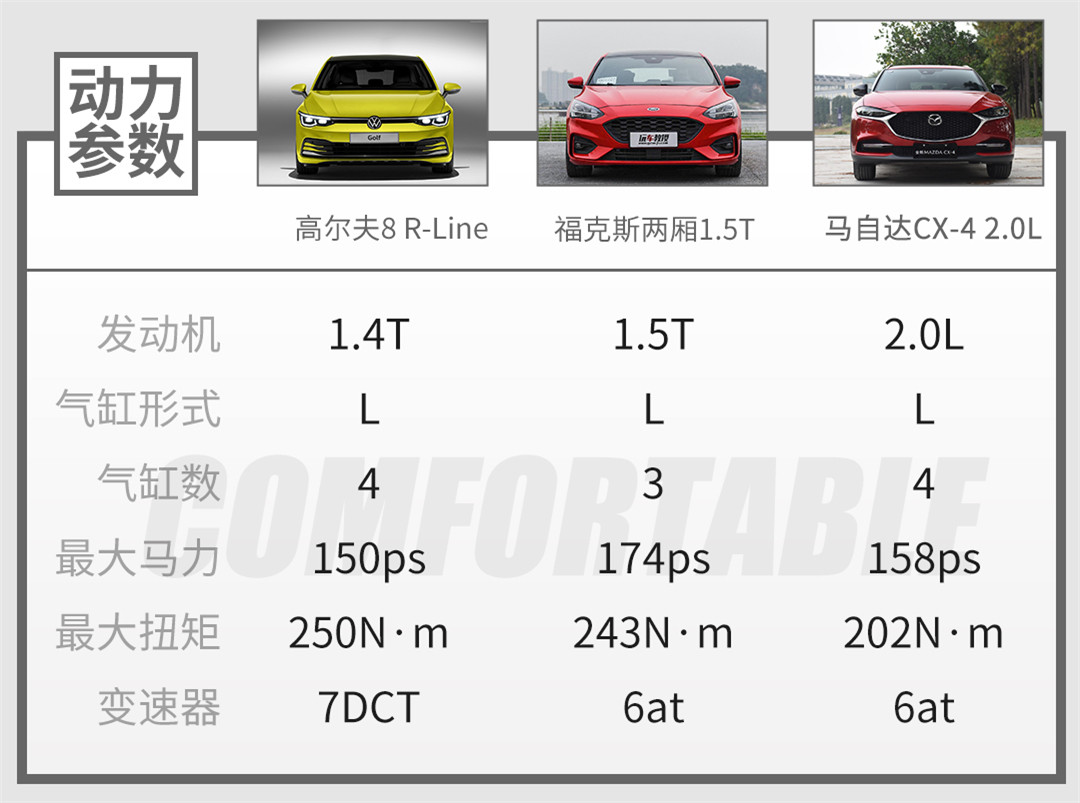 从动力来看的话,却是搭载1.5T三缸发动机的福克斯两厢最为优秀,其次便是搭载1.4T发动机的高尔夫8,不过需要注意的是高尔夫目前只推出的是普通车型,后续还将推出搭载2.0T发动机,最大功率为245Ps的GTI车型。