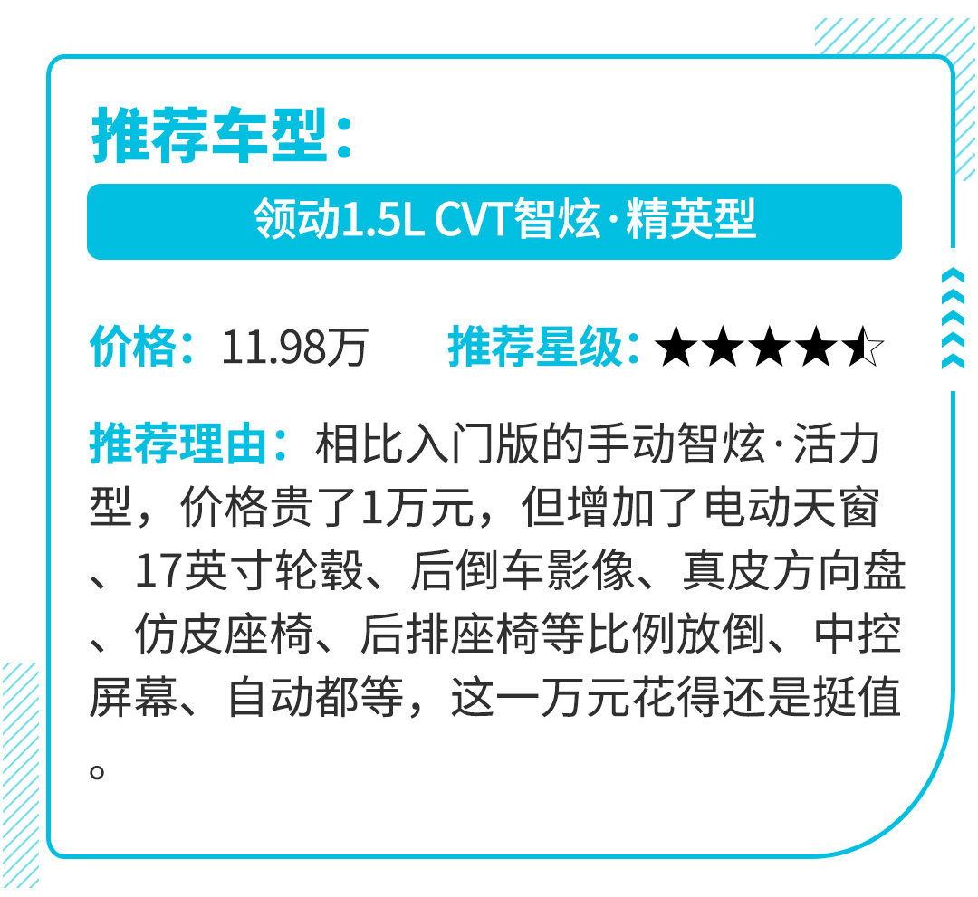 所以和朗逸一样,10万元能落地的领动,仍然以实用性为主,想要追求舒适性或者家用,买买君更推荐1.5L CVT智炫·精英型。1.5L+CVT变速箱,动力虽然没有1.4T强,但满足日常使用够了,而且动力输出线性,平顺性好,油耗相对更低并且可靠性较高。