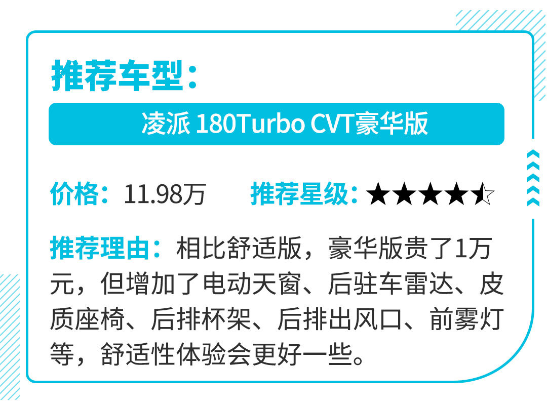同前面介绍的两款车型一样,10万元落地的凌派,仍然以实用性为主,如果想要有更舒适性的体验,买买君更推荐售价11.98万的180Turbo CVT豪华版。