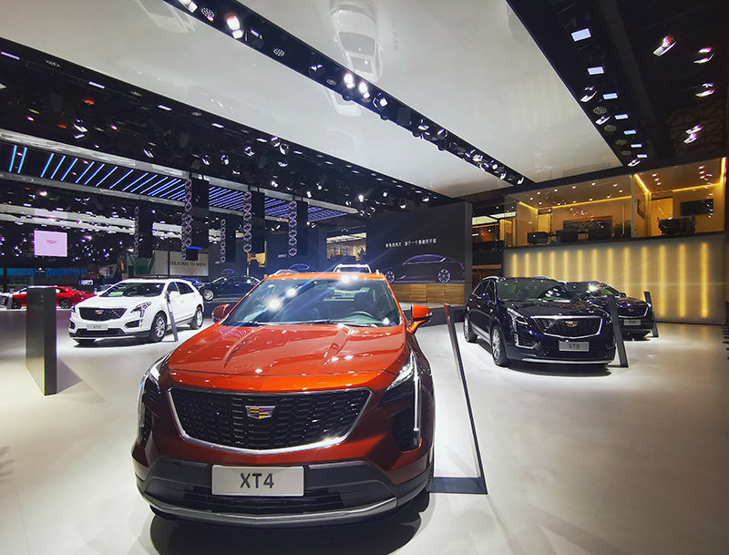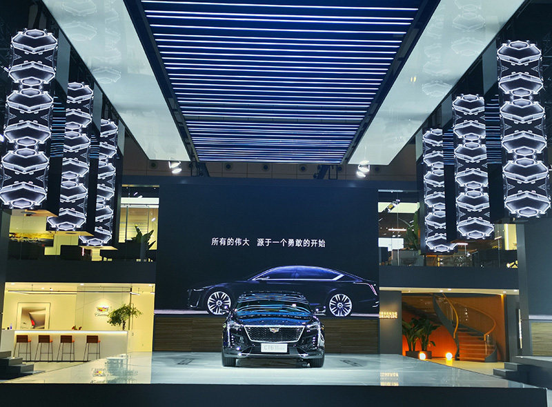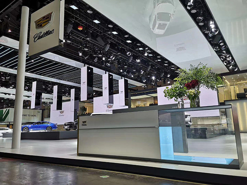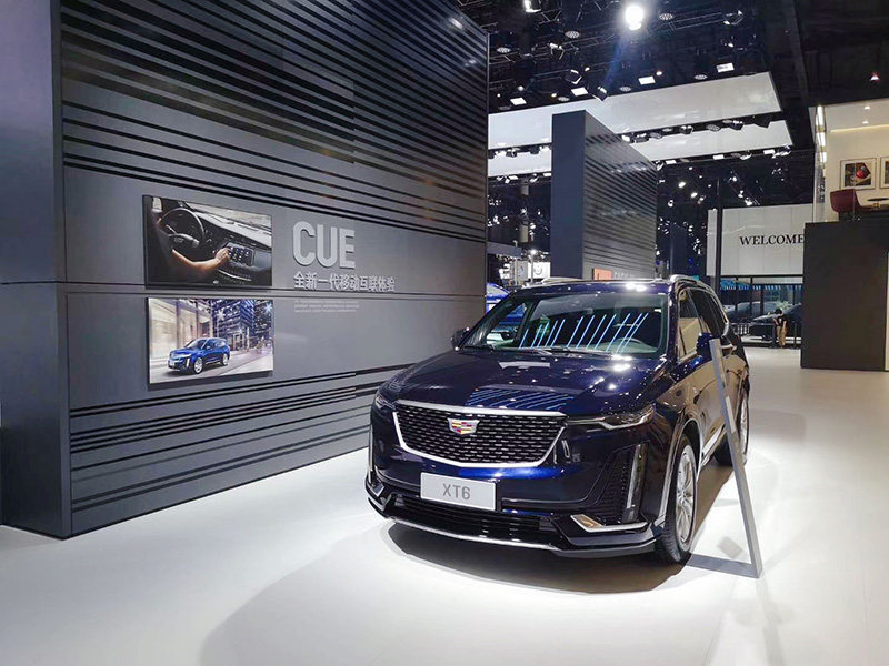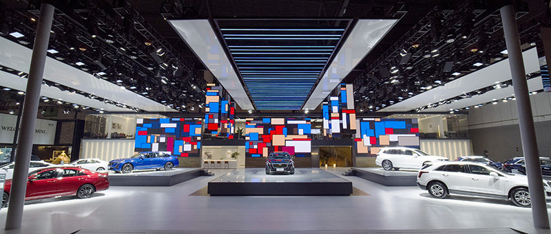 中央展台:高出地面的中央展台,以醒目姿态成为整个凯迪拉克展区的视觉中心,与两侧的分区展台一道将各展车区域和功能区域清晰划分。每块展台背后均配有LED大屏,或重点呈现展车亮点,或精彩演绎品牌故事,成为车展上最靓丽夺目的一道风景。