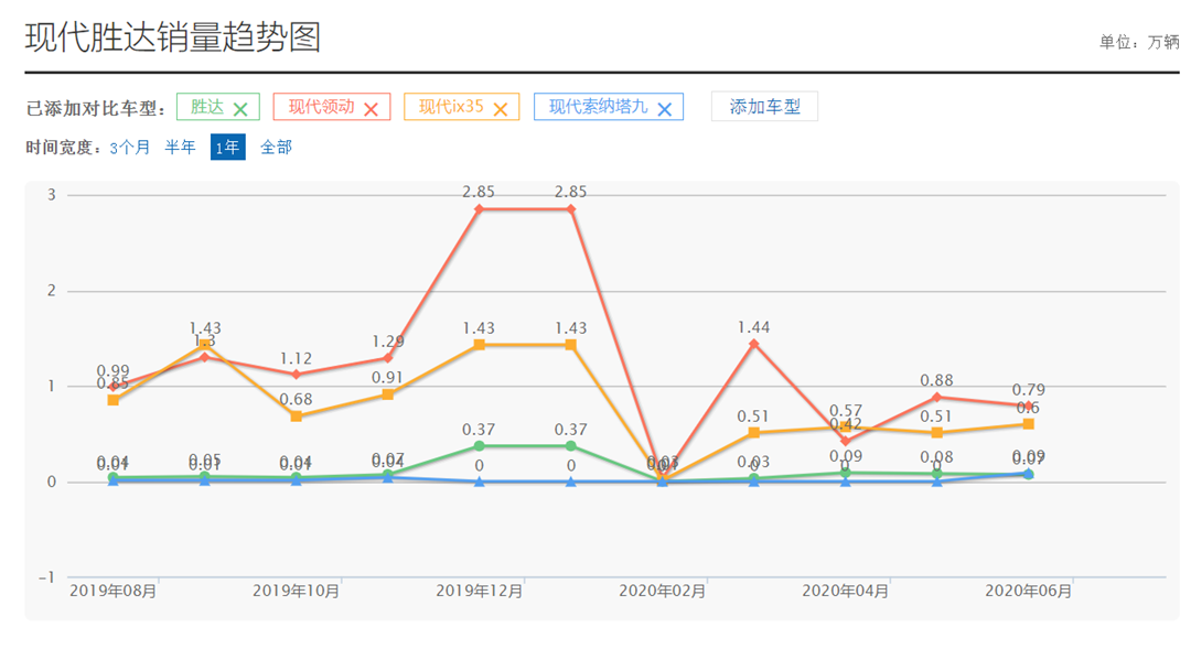 胜达(绿) 领动(红) ix35(黄) 索纳塔九(蓝)