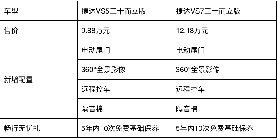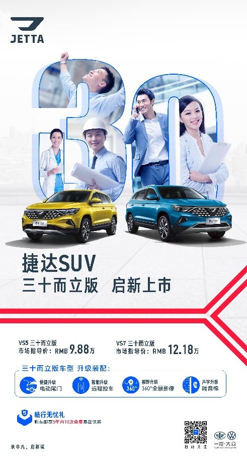 去年,捷达开启品牌化之路,短短10个月的时间,捷达快速布局了三款新车,覆盖A级轿车、A级及A+级SUV三个细分市场,创造了“捷达速度”,更在全球汽车发展史上,开创了从一个畅销车型升级到一个独立品牌的“捷达荣耀”。据悉,捷达品牌为感恩回馈440万车主长期以来陪伴与支持,特别推出VS5三十而立版、VS7三十而立版两款新车,作为捷达入华30年的里程碑式纪念车型,两款新车今日正式上市,售价分别为9.88万元(捷达VS5三十而立版)、12.18万元(VS7三十而立版)。