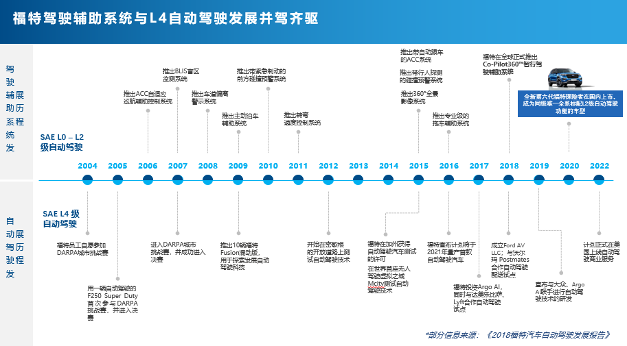 2018年,福特在全球范围内正式推出Co-Pilot360™智行驾驶辅助系统,它是一系列的智能驾驶辅助功能的总称,包括AEB智能感应制动保护系统、ESA紧急转向辅助系统,以及LC智能领航辅助系统、APA2一键泊车辅助等L2级别自动驾驶功能,IACC全速智能自适应巡航控制系统等等。