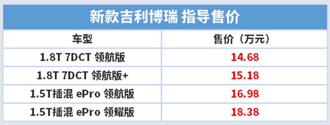 新款吉利博瑞于8月5日正式上市,新车提供燃油版和插电混两个版本共计四款车型,售价区间为14.68-18.38万元。