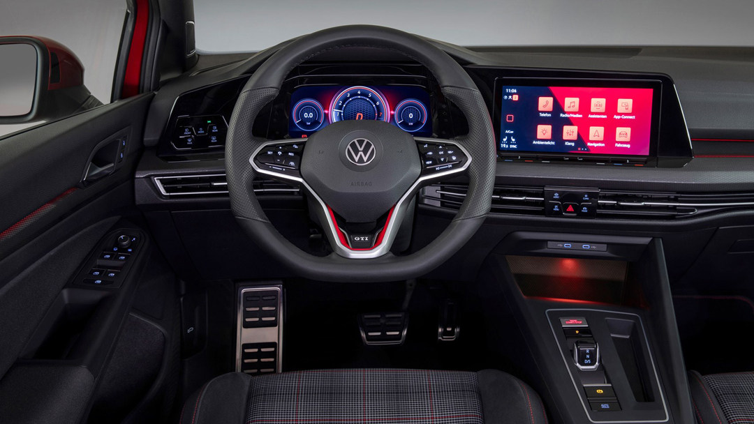 如果说外观上第八代GTI还保留了上一代的影子,那么内饰上可以用脱胎换骨来形容。整体造型以科技化、数字化为核心。相比起普通版车型,GTI使用更多红色缝线以及装饰件来营造运动感,例如方向盘上的红色装饰以及GTI LOGO、红色基底的中央显示屏。